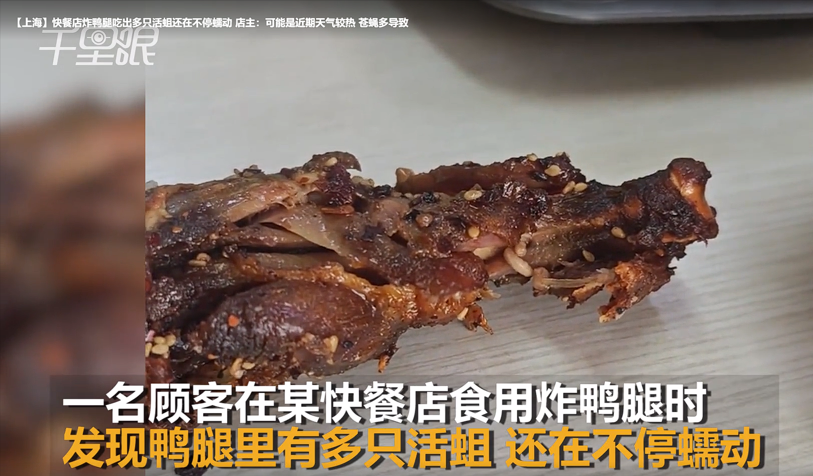 2025年10月11日,上海一名顾客在某快餐店食用炸鸭腿时,切开后发现多只白色活蛆从肉缝中钻出,虫体长度约3毫米,并在酥皮下持续蠕动。顾客当即漱口缓解不适,但拒绝了店家提出的退款或赠饮方案,坚持保留证据并投诉。涉事门店回应称,因近期高温导致苍蝇增多,且“首次发生此类问题”,事后宣布永久下架炸鸭腿菜品。