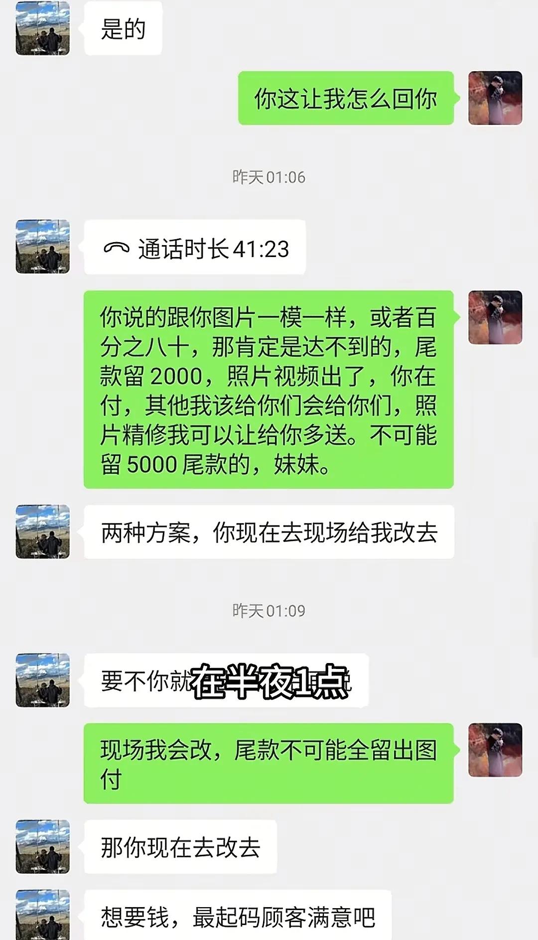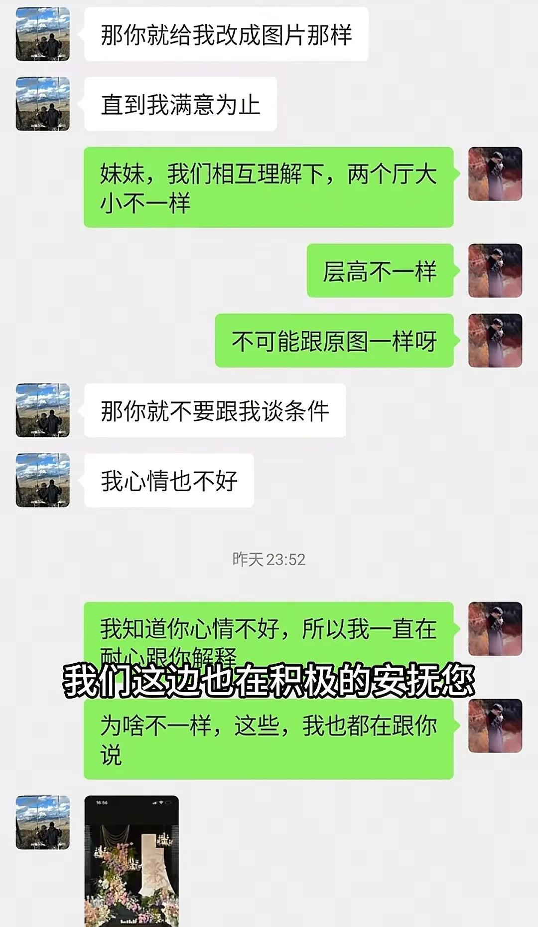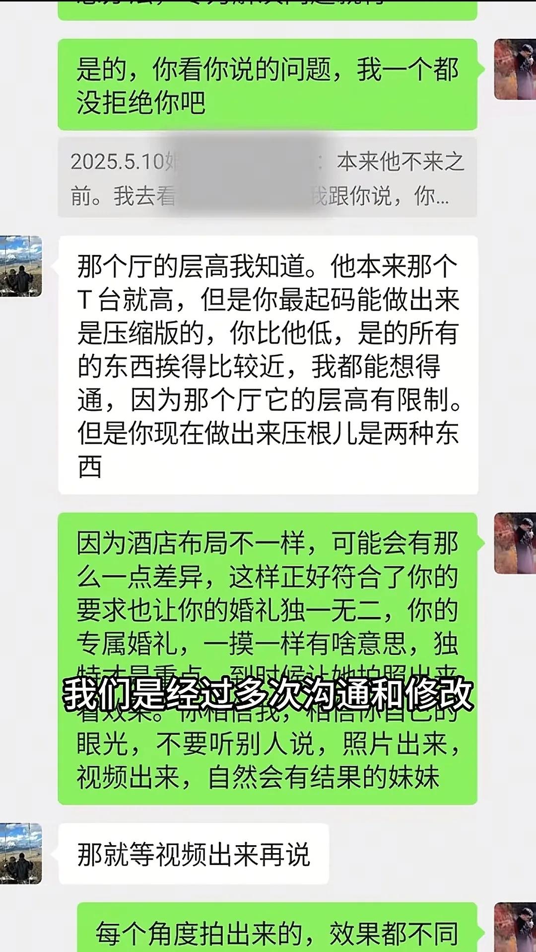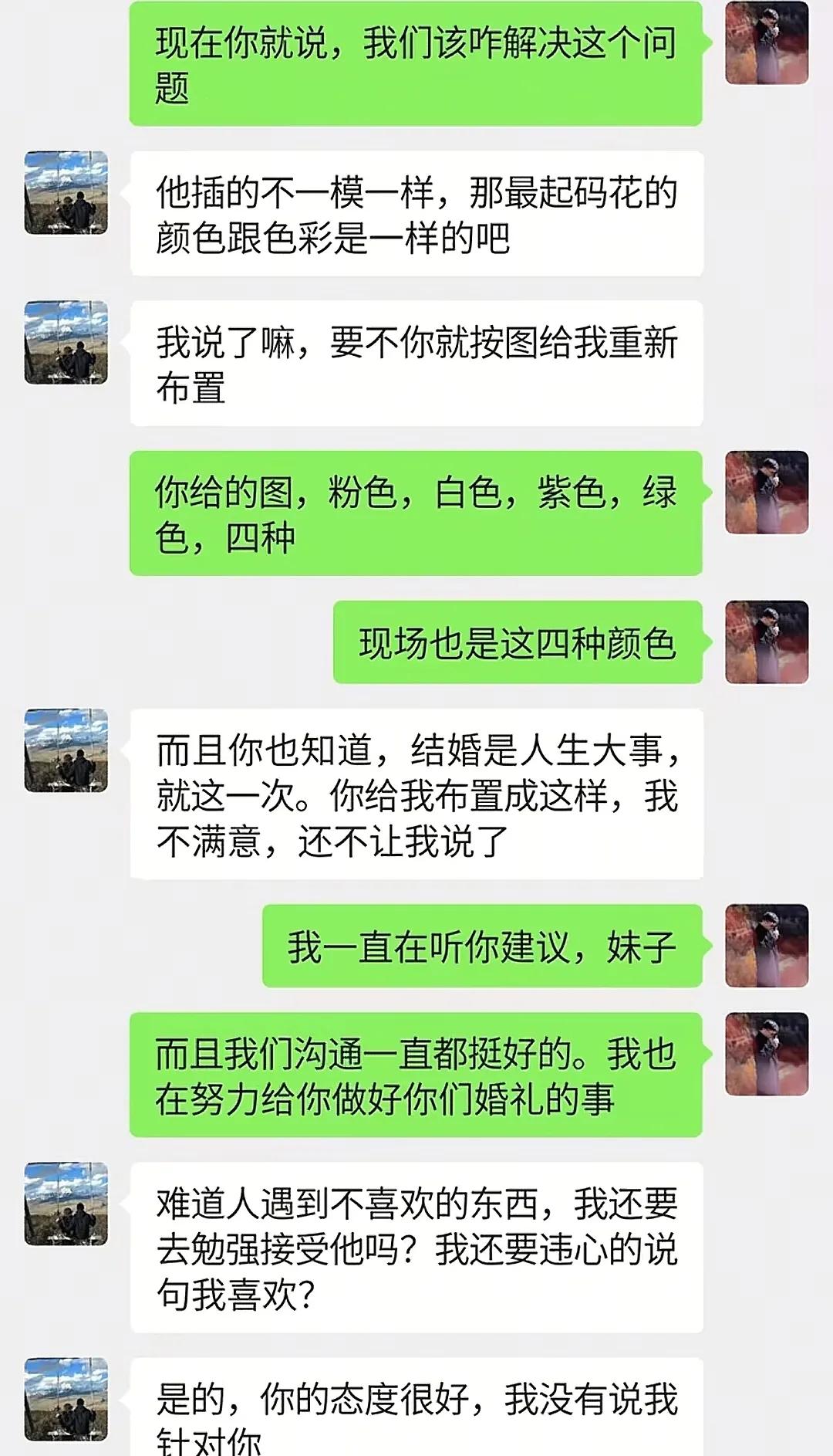 从聊天记录我们可以看到,婚庆公司的人说第二天早上去改,因为花艺老师已经回去,其他人也都休息了,保证明天新人到酒店时,花艺肯定变了就行。
