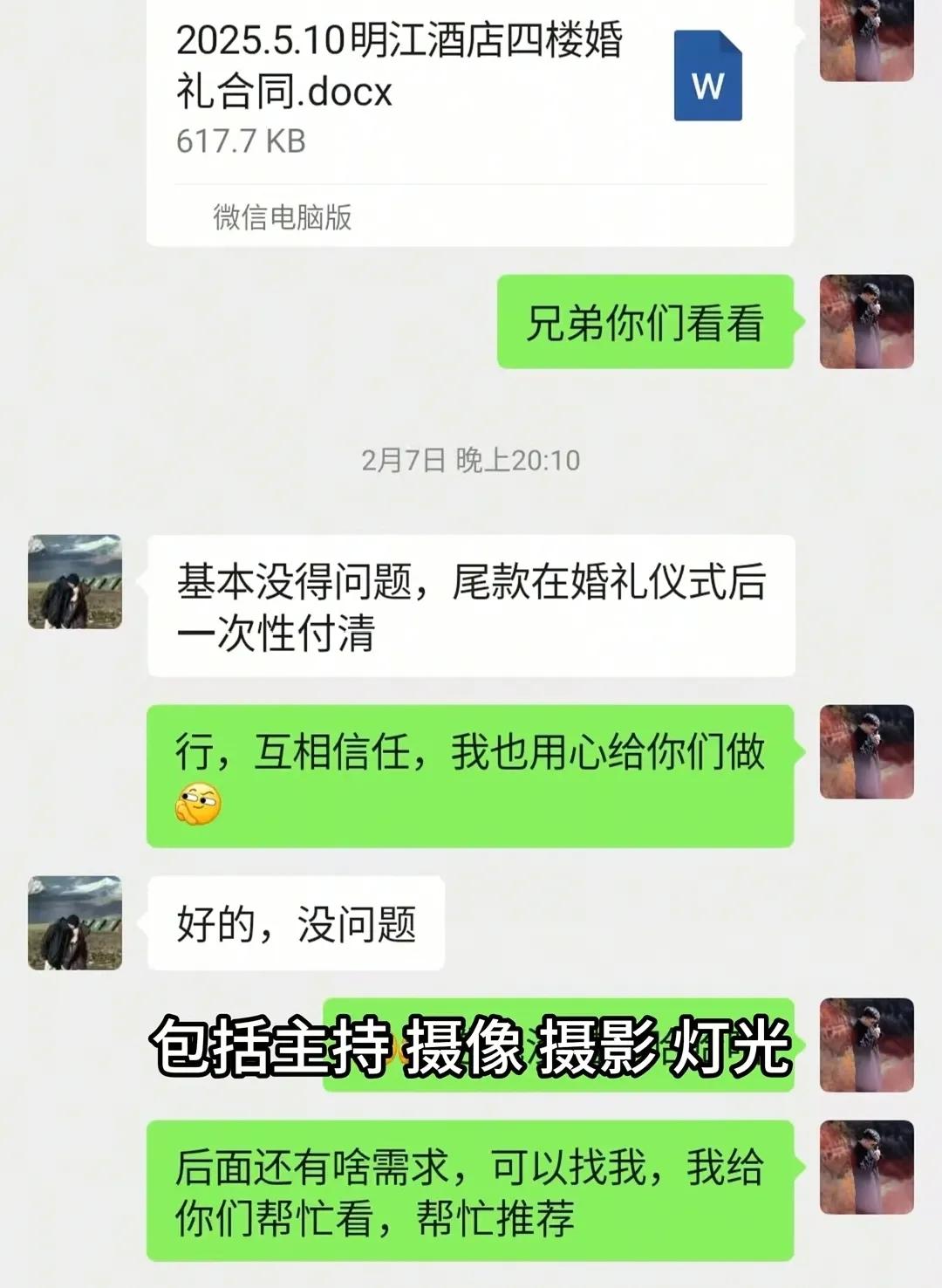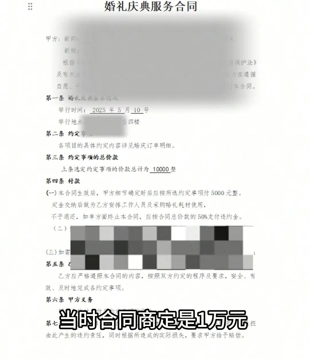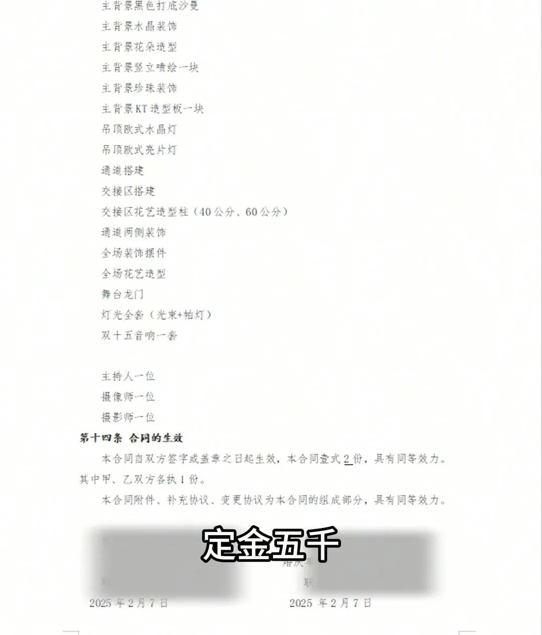 而根据他们当时跟新人的合同商定是1万元,定金是5000块,包括主持、摄像、摄影、灯光,以及现场布置。