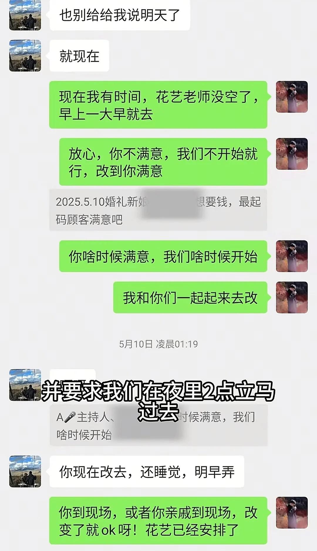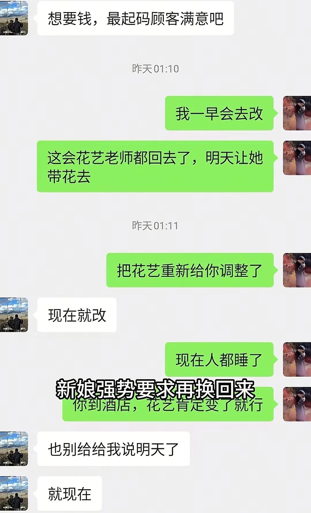 可就在半夜1点,新娘又强势要求再换回来,并要他们在夜里2点就过去婚礼现场改。