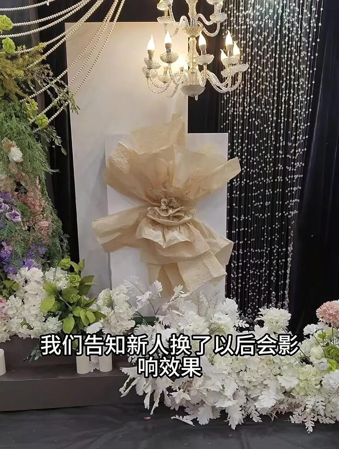 婚庆公司负责人表示,婚礼前一天也就是彩排时间,新娘让他们把背景板换成香槟色,但他们担心换了以后会影响效果,可新人还是坚持己见。