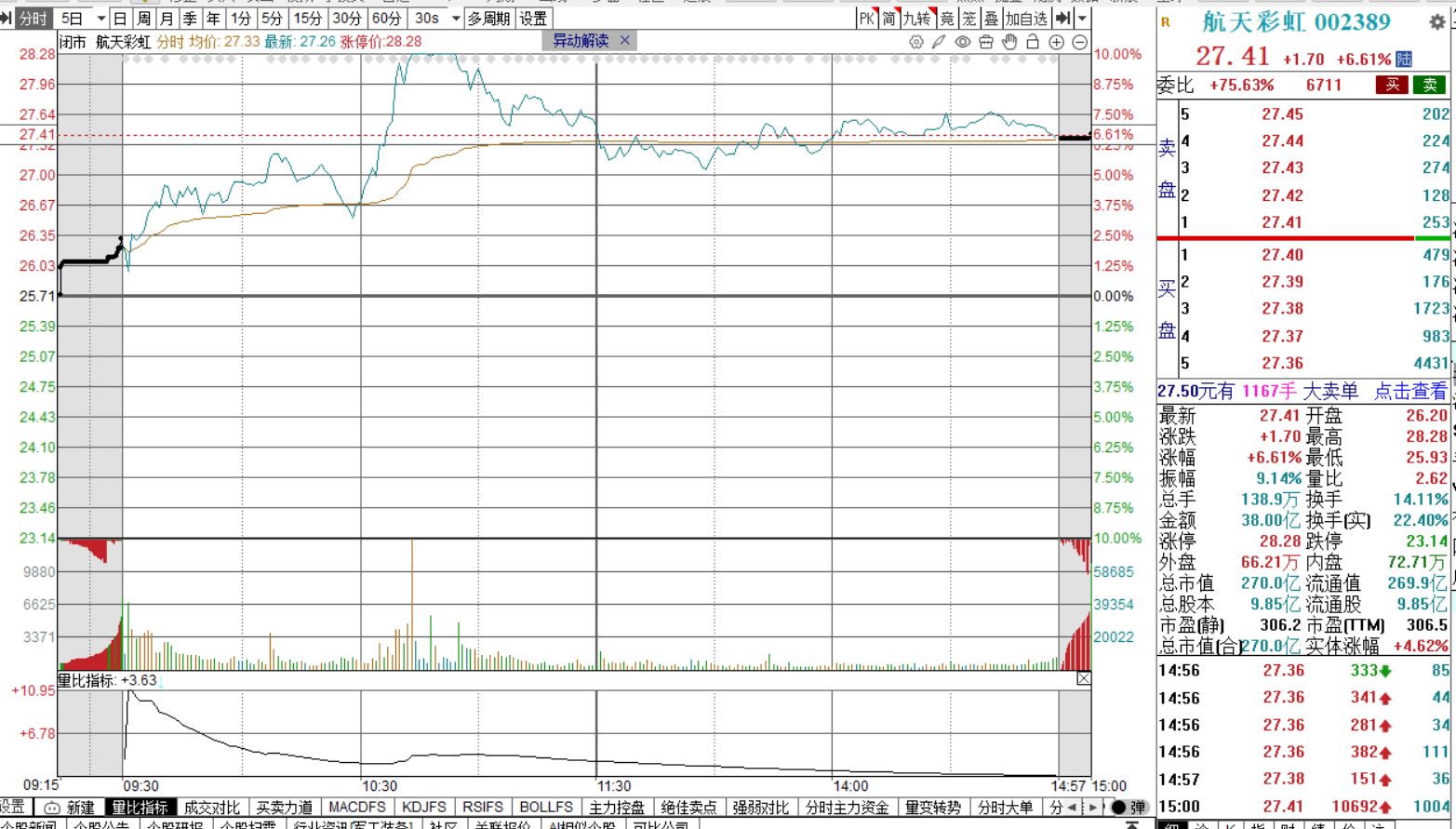 2026年1月9日,航天彩虹盘中触及涨停后炸板,最终收涨6.61%,全天成交额38.0亿元,换手率14.11%。这一走势引发市场对军工板块及商业航天主线的关注,本文将从资金面、技术面、基本面及板块联动四维度展开分析。