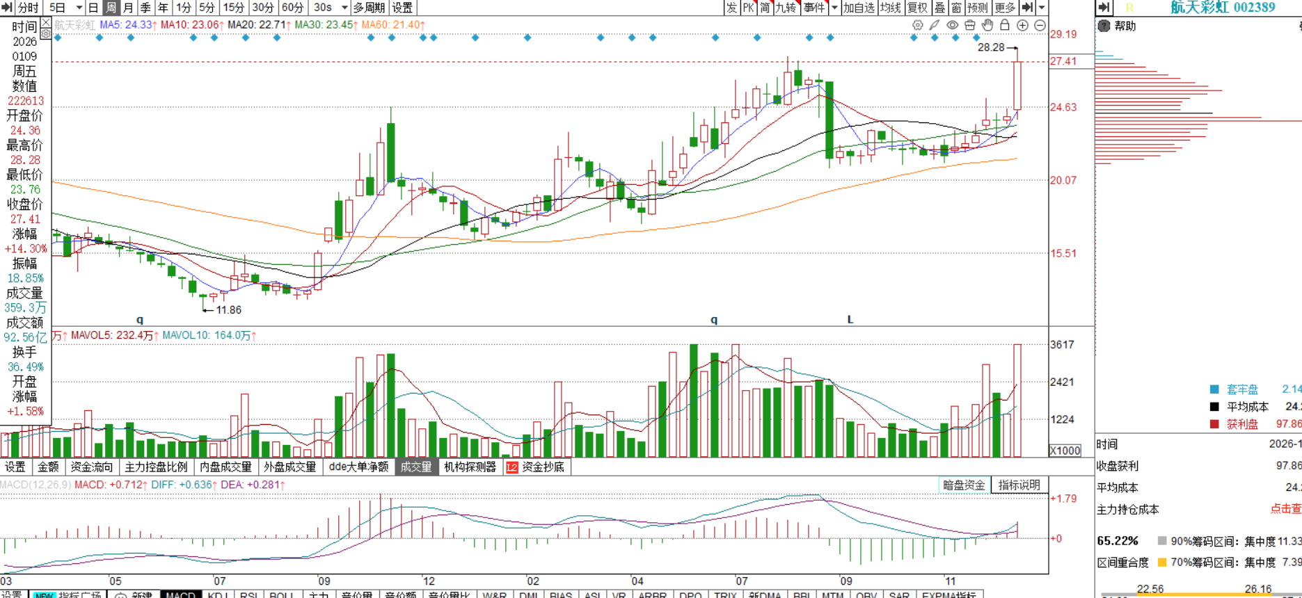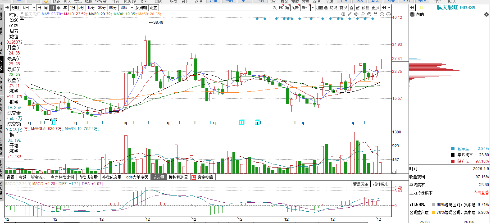 2026年1月9日,航天彩虹盘中触及涨停后炸板,最终收涨6.61%,全天成交额38.0亿元,换手率14.11%。这一走势