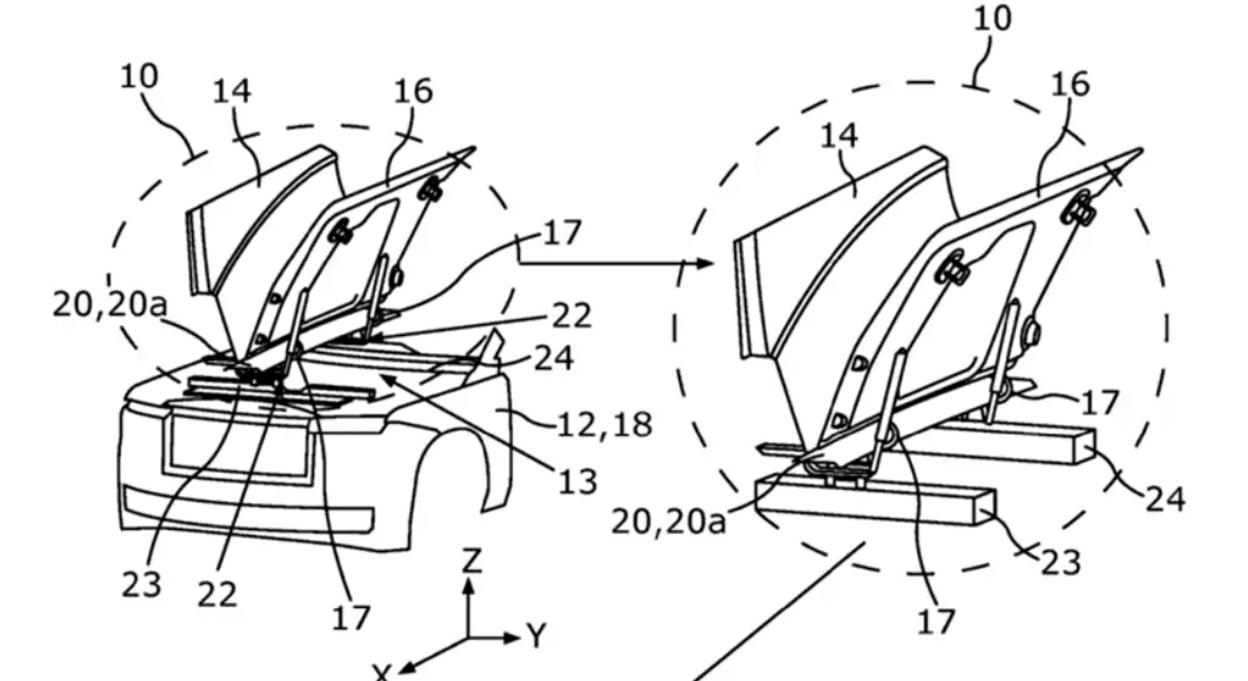 同时,前机盖的设计,也很有特点。被划分成了3个部分,中间是一条筋线,前方放置可伸缩的飞天女神立标,两侧为独立的盖板,可以各自向中间的筋线处抬起,并采用了铰链结构,相当有新意和原创度。