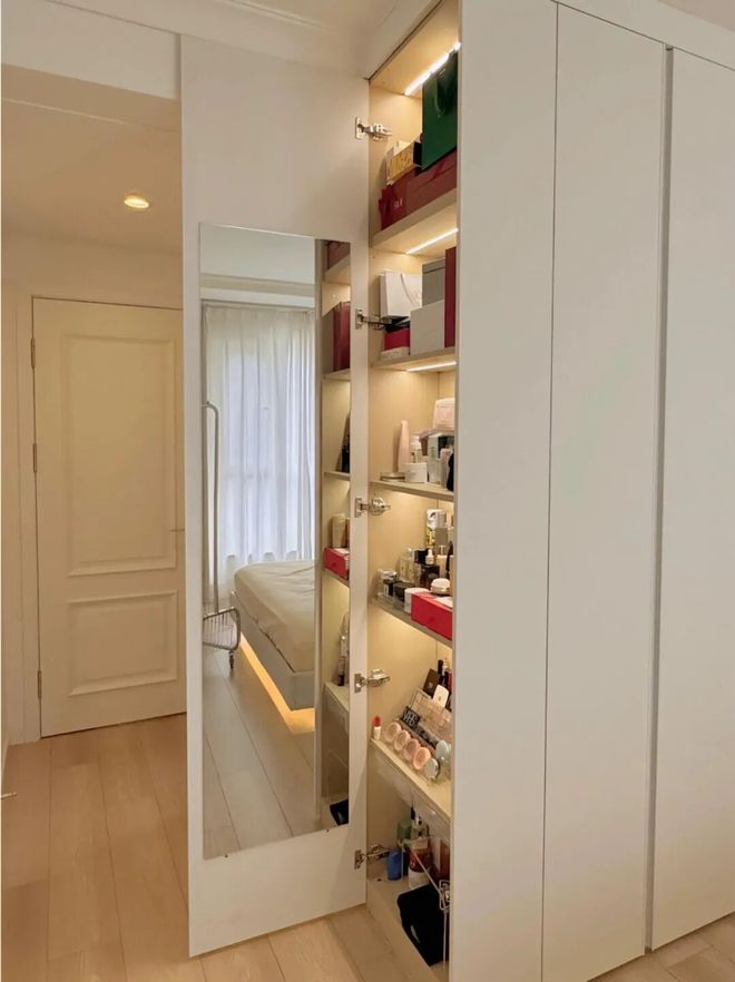 比如将其设计成「侧开门结构」,当成一个化妆柜来使用,解决家里没有化妆区的尴尬。