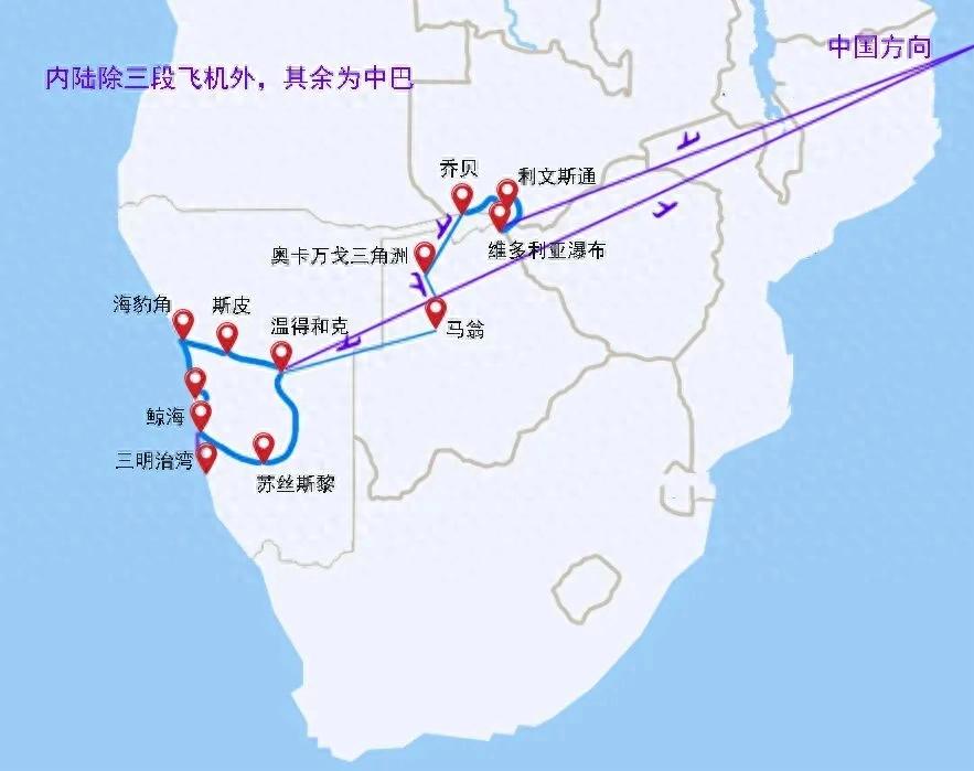 行程中安排了3段内陆飞机,省时间、省体力。分别是:乔贝-奥卡万戈三角洲;奥卡万戈三角洲-马翁;马翁-纳米比亚(温得和克)