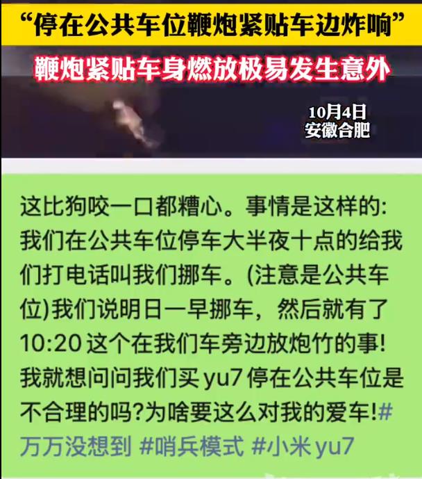 事发安徽合肥某小区外的公共停车区域,一位女车主将新购置的车辆停放在公共停车位上,不料被人用鞭炮“暗算”,损失千元。(素材来自封面新闻)