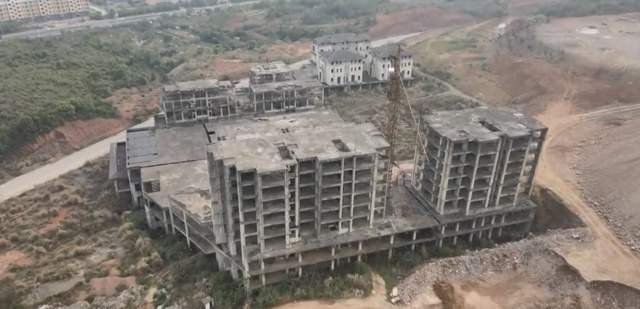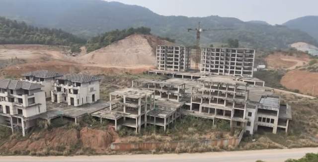 几栋别墅形貌犹在,白墙黑瓦的构架依稀透出当初的雅致,如今却只剩空洞的窗门,杂草漫过台阶,甚至从墙缝间钻出倔强的树苗。一旁的几幢高楼仅存水泥框架,锈蚀的钢筋裸露在外,楼板上散落着碎砖与残瓦,连施工时常见的防护网也已不见踪影。