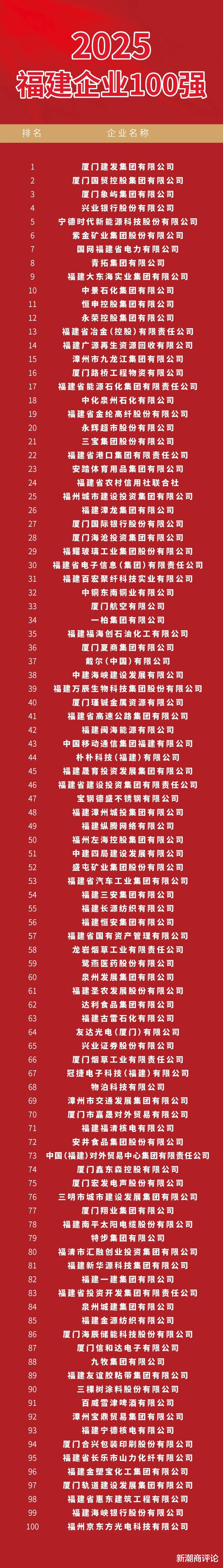 虽然营收同比减少9.7%至3620.13亿元,但宁德时代仍然稳居百强榜单第五,同时夺得“2025福建制造业企业100强”第一,领先紫金矿业(3036.40亿元)、青拓集团(1437.0亿元)、大东海集团(1220.53亿元)。