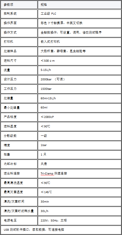 高压均质器是物料在柱塞的往复运动的作用下,输送到一个大小可调的阀组中,受到极强的压缩作用,在通过限流狭缝时,以极快的速度撞击在均质阀,产生空穴效应、撞击效应和剪切效应,使团聚的物料均匀分散。内置换热系统,全程4℃低温环境冷却,样品全程无高温停留,主要应用于:大肠杆菌、酵母菌、各类哺乳动物细胞(VREO、293、二倍体)。