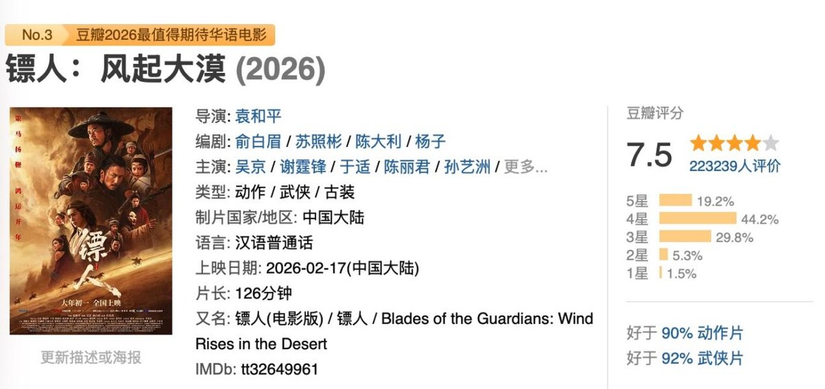 在《飞驰人生3》持续领跑、多部热门影片口碑小幅松动的情况下,改编自经典国漫的武侠电影《镖人》凭借过硬质量实现票房连续逆跌,一路强势反超《惊蛰无声》,成功跃居单日票房前列,成为整个档期最亮眼的黑马。