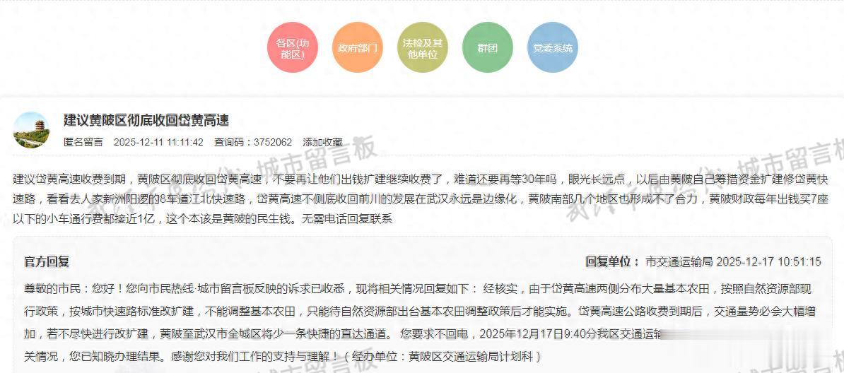 官方回复:经核实,由于岱黄高速两侧分布大量基本农田,按照自然资源部现行政策,按城市快速路标准改扩建,不能调整基本农田,只能待自然资源部出台基本农田调整政策后才能实施。岱黄高速公路收费到期后,交通量势必会大幅增加,若不尽快进行改扩建,黄陂至武汉市全城区将少一条快捷的直达通道。