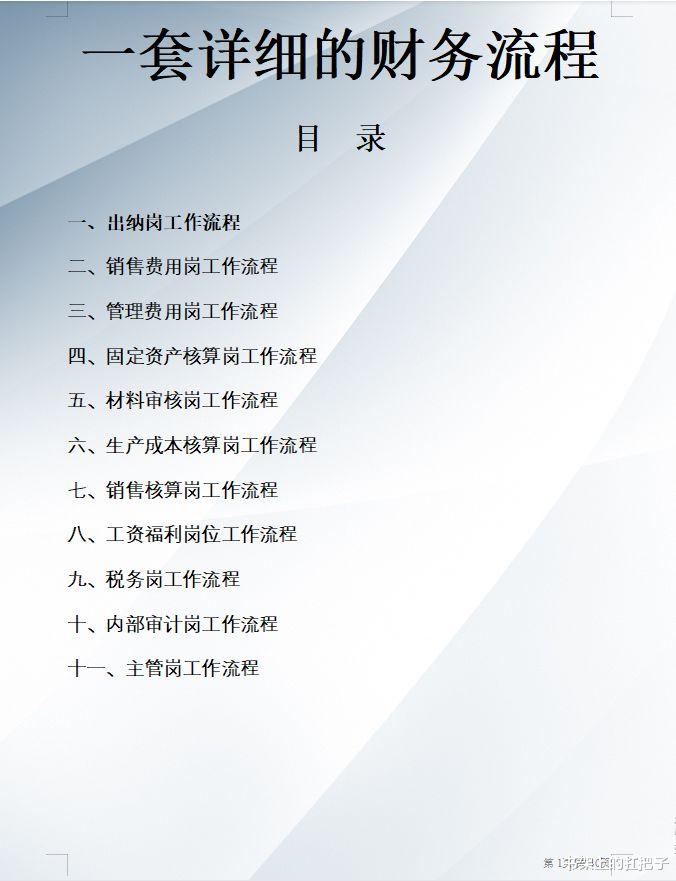 今天给大家整理的是一套详细的财务流程;主要是出纳、销售费用、固定资产核算、生产成本费用、工资福利、管理费用等等。