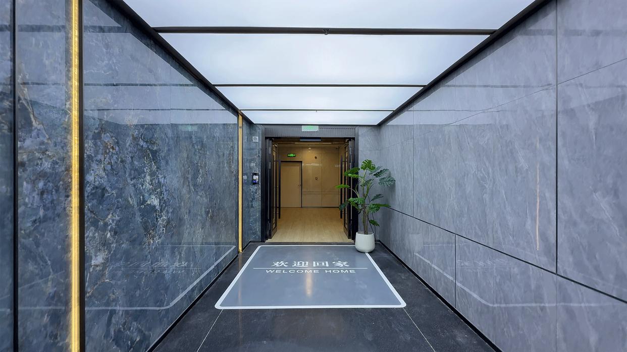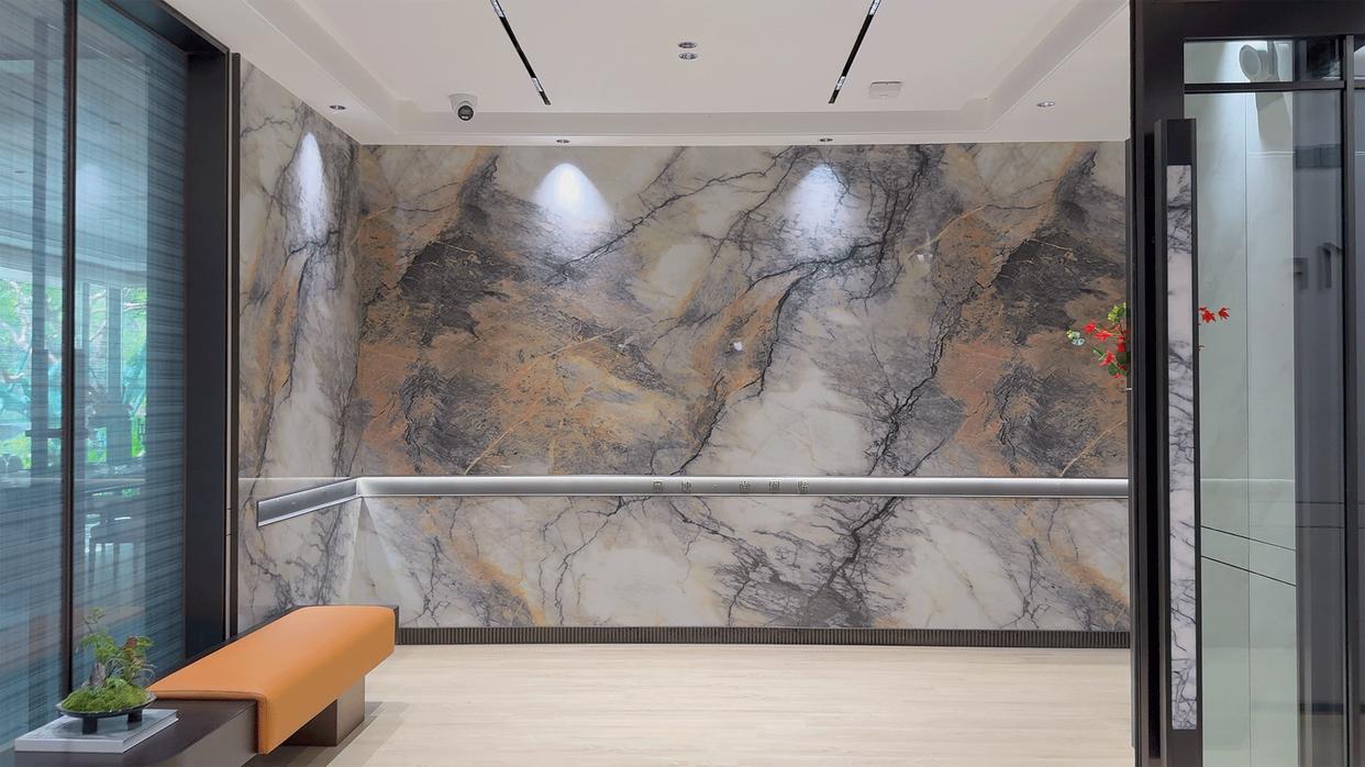 接下来我们到地下空间看看,尚阖院地上地下大堂都采用了同样的风格和材质。更进一步的是,地下大堂入口大范围使用了“亚马逊绿纹理”岩板,很奢侈。