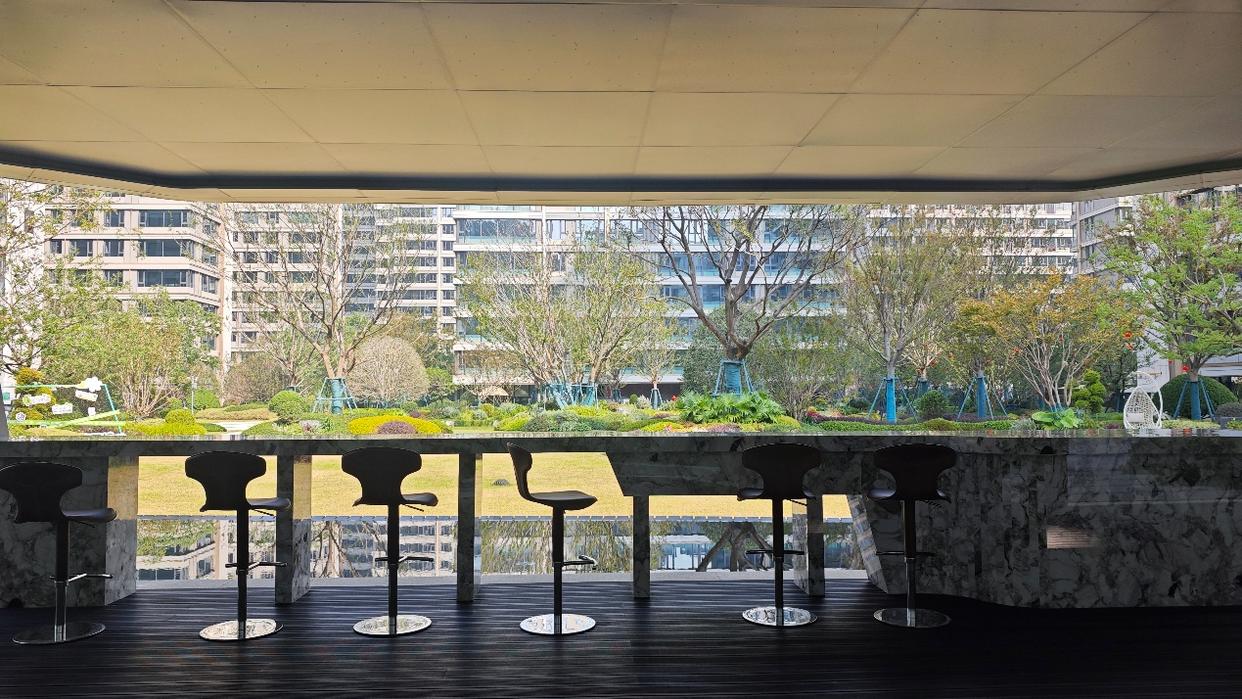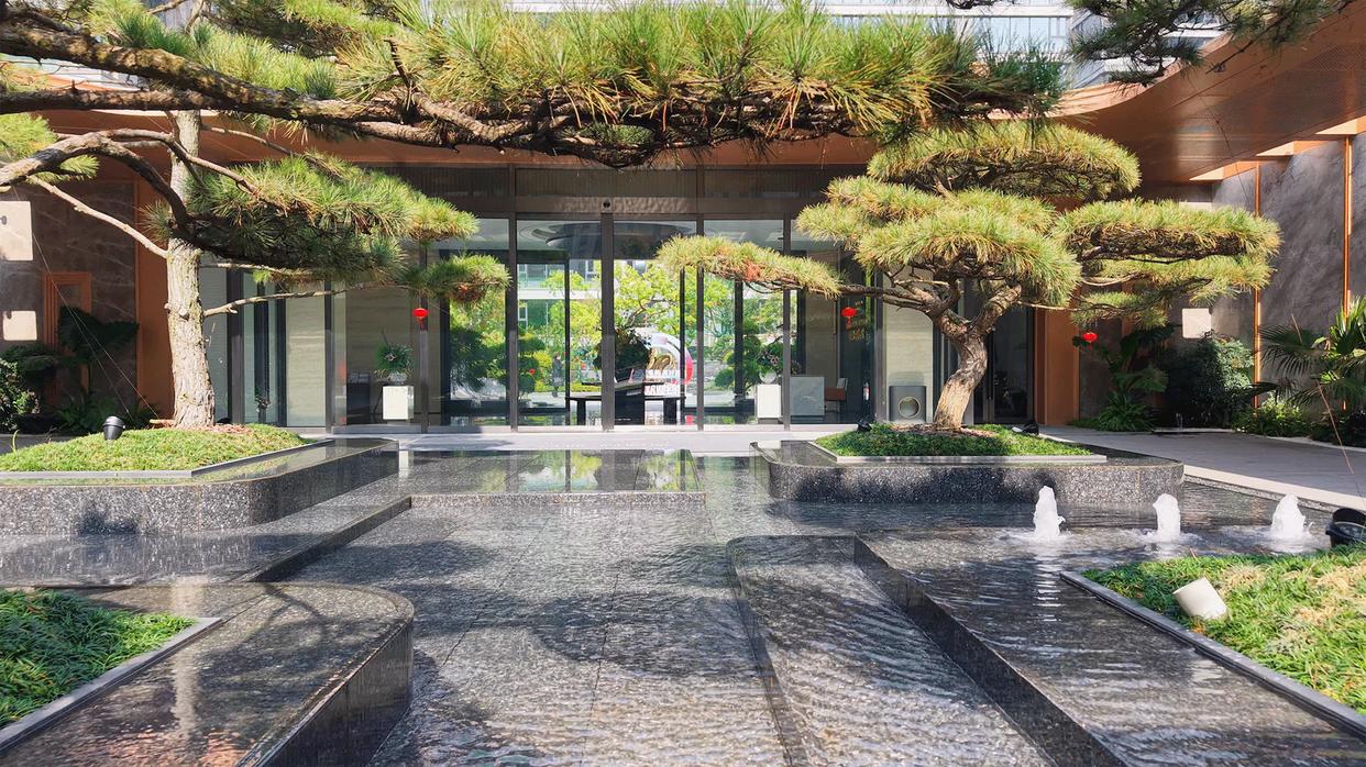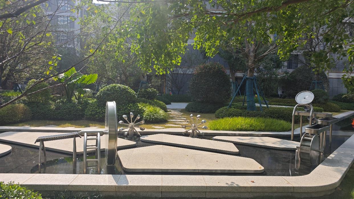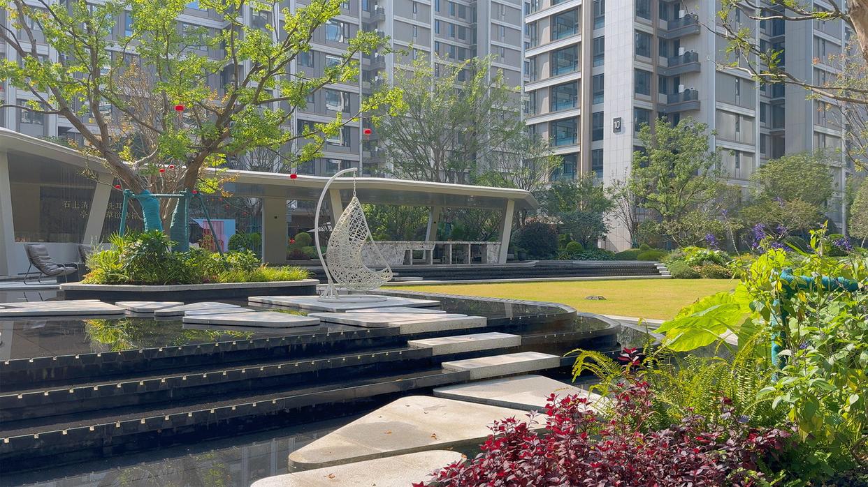 进入小区后,首先看到的是面积很大的迎宾水院,这个规模在不少项目都是在中央景观区。高速还在其中设置了一组座椅,绿植、水景环绕,很有度假感。