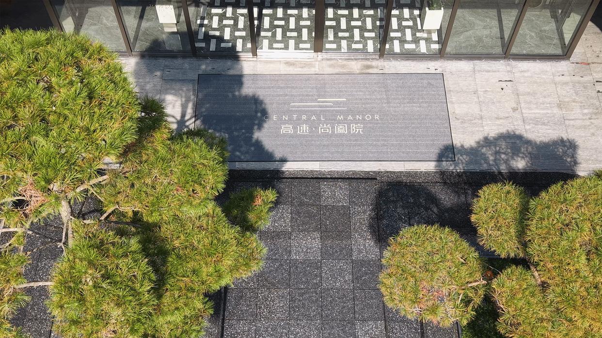 A区(下文简称尚阖院)主大门是南门,在嘉陵江路上,用了大量的石材和铝板,很有质感。但最大的特点还是拥有约35米的进深,形成了一个递进式归家动线,而且酒店式大堂设计双面大玻璃面,特别通透。