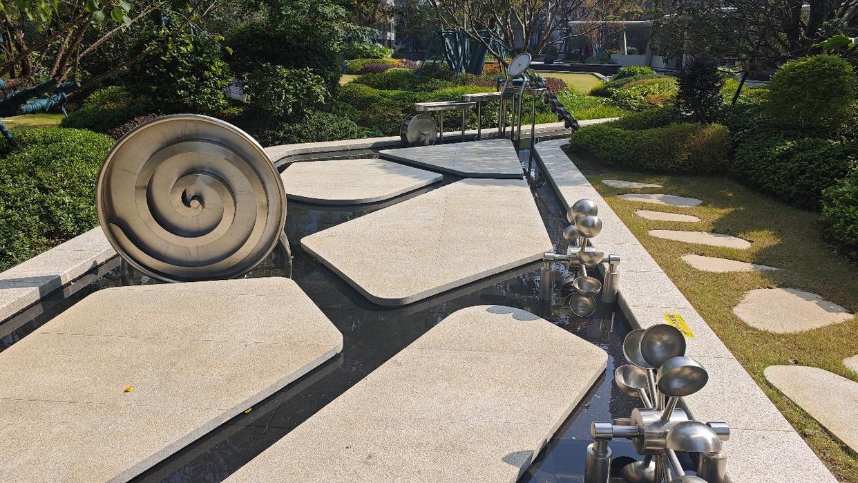 尚阖院在核心景观区还有个很具创意的设计,项目把核心景观区的水系和西侧的儿童游乐区连接在一起,搭配了几座童趣水车,很有意思,班长踩盘时也没忍住玩了一会,夏天肯定非常受小朋友欢迎。