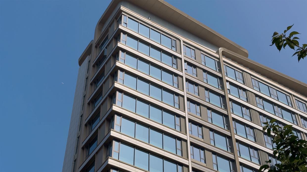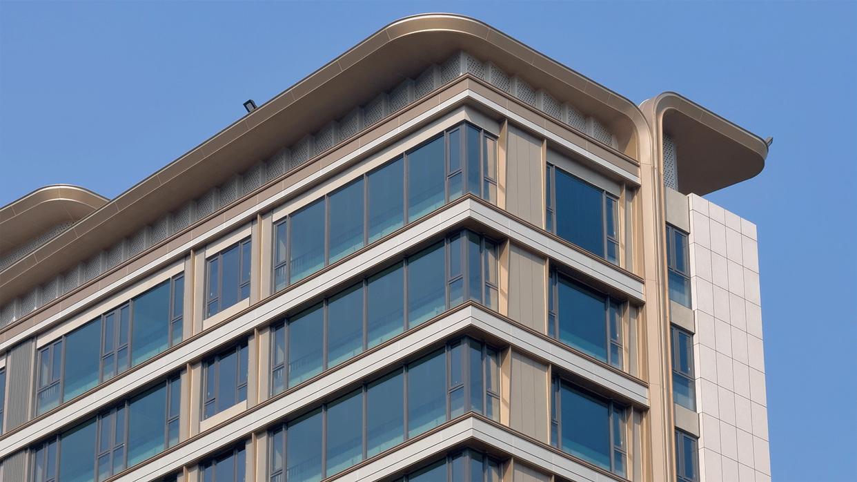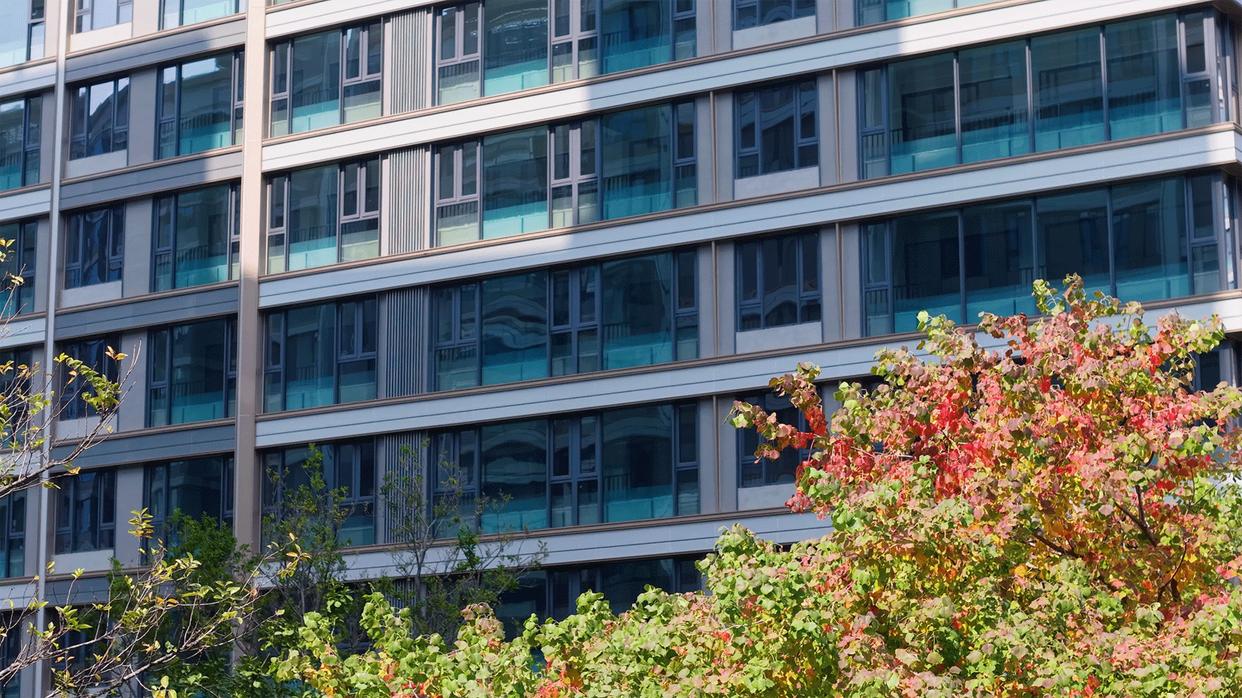 下面我们到楼栋看一下,外立面和B区一致,采用公建化设计,并选用大面积LOW-E中空玻璃,再结合顶部“花开华冠“浪漫造型,视觉效果极具质感和美感。