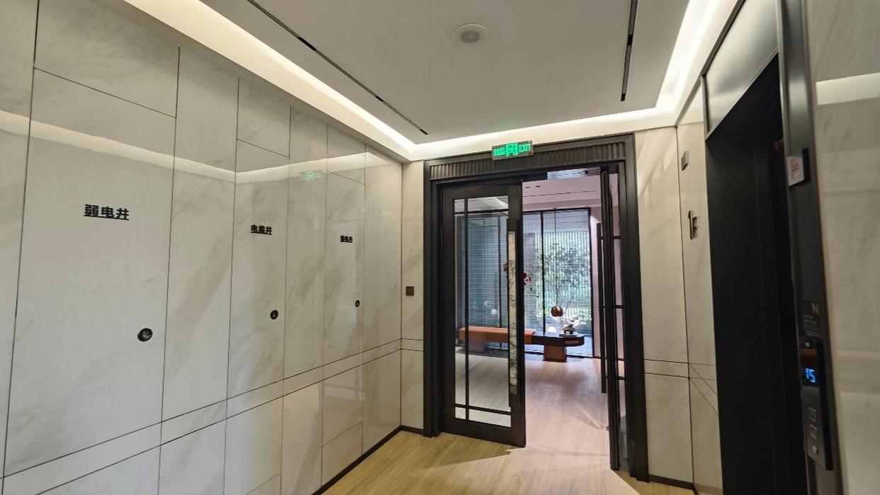 入户大堂内的大面“金玉满堂”岩板背景墙很吸睛,其它如内嵌石材的大门扶手,古木纹拼花大理石地面,顶部流线型艺术灯等结合在一起,共同营造了一个轻奢氛围。