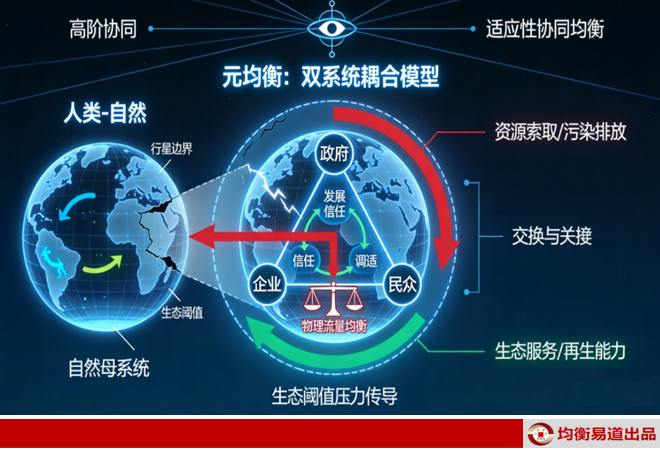 “元均衡”包含两个核心层次:一是物理流量均衡与适应性协同均衡。前者是底线,要求人类索取资源与排放污染的速度不得超过自然的再生与净化能力,这是文明存续的刚性约束。二是智慧,要求人类发展出生态感知与适应性治理能力,主动调整社会经济发展模式,使之与自然节律长期协同,实现动态共生。