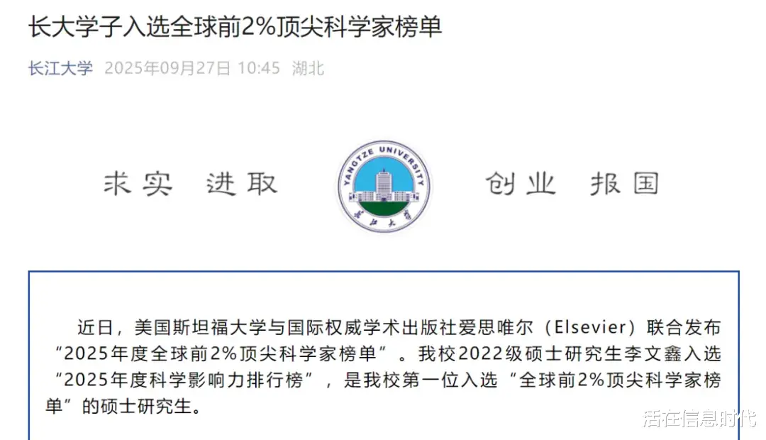 这几天,长江大学一位硕士生入选了美国斯坦福大学与国际权威学术出版社爱思唯尔(Elsevier)联合发布“2025年度全球前2%顶尖科学家榜单”这事,引起了全网的关注,长江大学更是喜哄哄的将其在长江大学的公众号上好顿宣传。