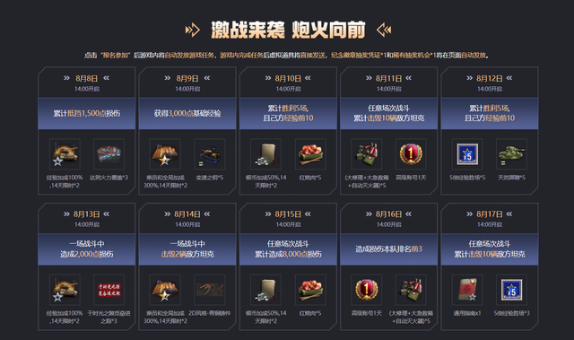 这次活动从8月8日持续到18日,玩家只要前往坦克世界官网报名即可在游戏内接到任务,完成任务便会自动发放抽奖凭证!每天一张,十次抽奖机会,除了精美的纪念章还有机会获得限量联名周边!