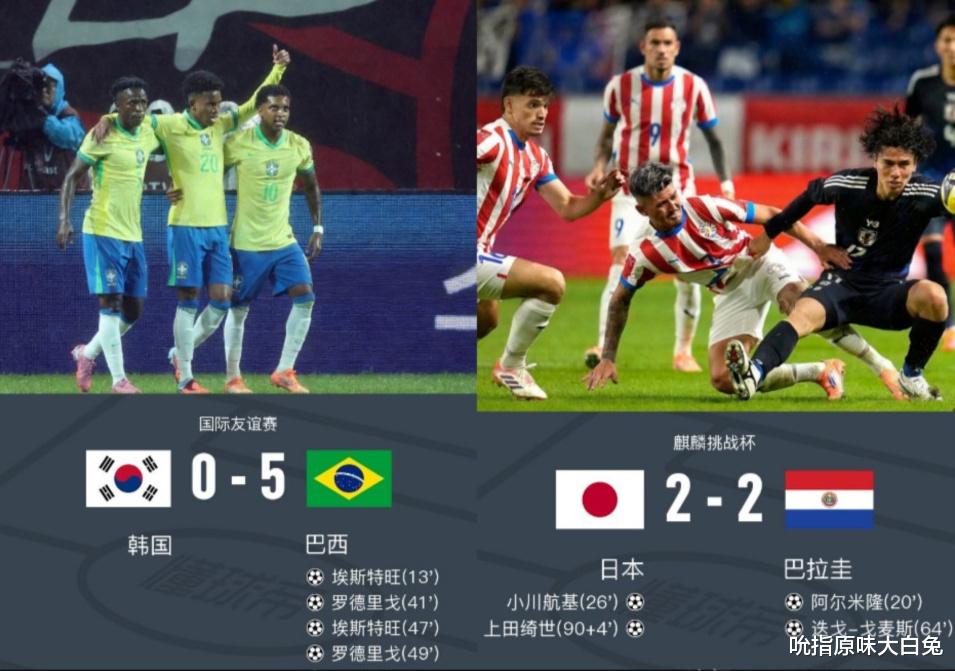 日本队跟韩国队同一天进行了两场热身赛,日本队2-2巴拉圭,而韩国队0-5巴西队。要看身价方面,日本队首发阵容是1.16亿欧元,巴拉圭首发则是5800万欧元。韩国队首发阵容是1亿欧元,巴西队首发是5.71亿欧元,不过他们的教练是安切洛蒂。