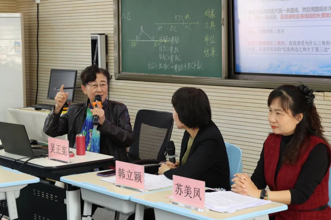 其次,苏美凤老师对本节课进行了说明:本节课聚焦周长的认识,重在帮助学生理解几何概念、建立度量意识,并在明确周长概念的基础上开展尺规作图活动。随后吴正宪老师进行点评,指出周长具有有限可加性,通过尺规作图开展测量活动,也为后续学习周长计算公式做好了铺垫。