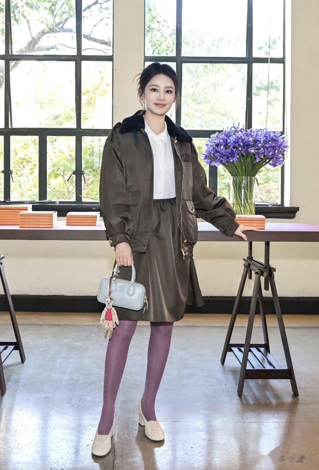是带毛领的深棕工装风,内搭简约白衬衫,下身搭配同色系半身裙,整体色调和谐。紫色丝袜增添了一丝俏皮与个性,搭配浅米色粗