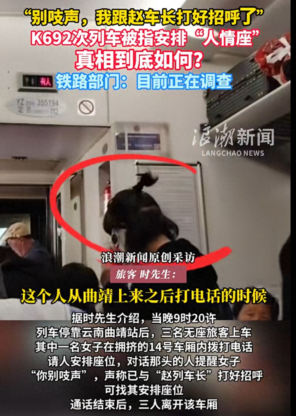 2月23日晚,途经云南曲靖的K692次列车,因一起疑似“人情座”事件引发关注。