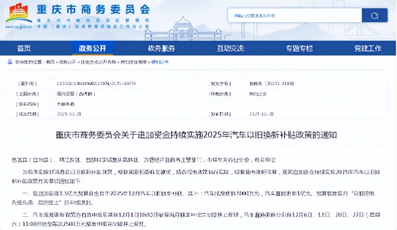 10月28日,重庆市商务委发布最新消息:重庆市12月新增1.3亿元汽车置换更新专项补贴。