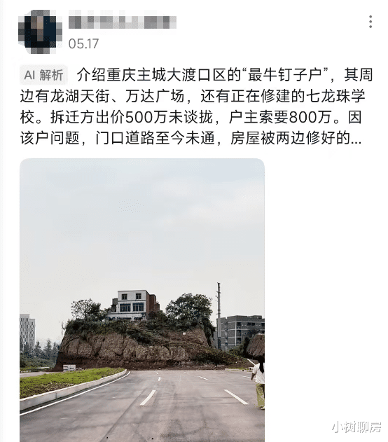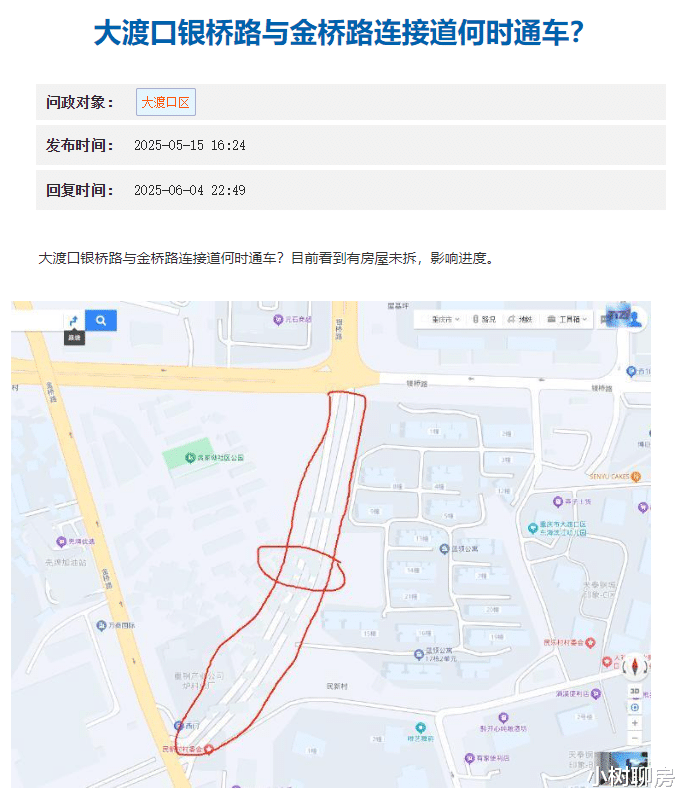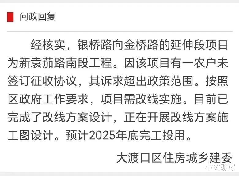 04.尾声看到这里,肯定很多粉丝要问了,这个“大渡口最牛钉子户”的结局是什么呢?今年5月,有网友询问银桥路与金桥路连接道何时通车,有房屋未拆影响了进度。相关方面回复称:经核实,银桥路向金桥路的延伸段项目为新袁茄路南段工程。因该项目有一农户未签订征收协议,其诉求超出政策范围。按照区政府工作要求,项目需改线实施。目前已完成了改线方案设计,正在开展改线方案施工图设计。预计2025年底完工投用。