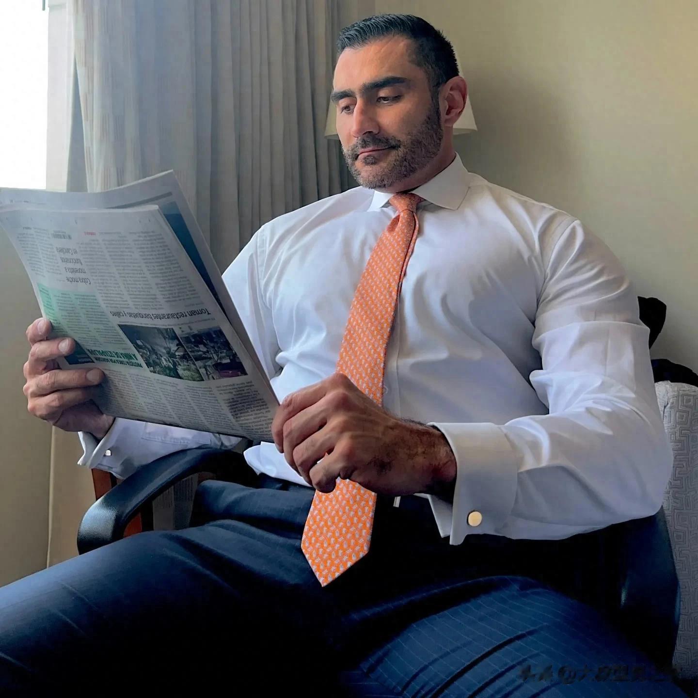 画面中的男士,身着笔挺的白衬衫,搭配一条色泽明亮、图案精致的橙色领带,下身是质感上乘的深蓝色西裤,尽显职场绅士风范。此刻,他正闲适地坐在椅子上,手中捧着一份报纸,专注于油墨文字间,仿佛在繁忙工作之余,享受着这片刻的宁静与知识的滋养。