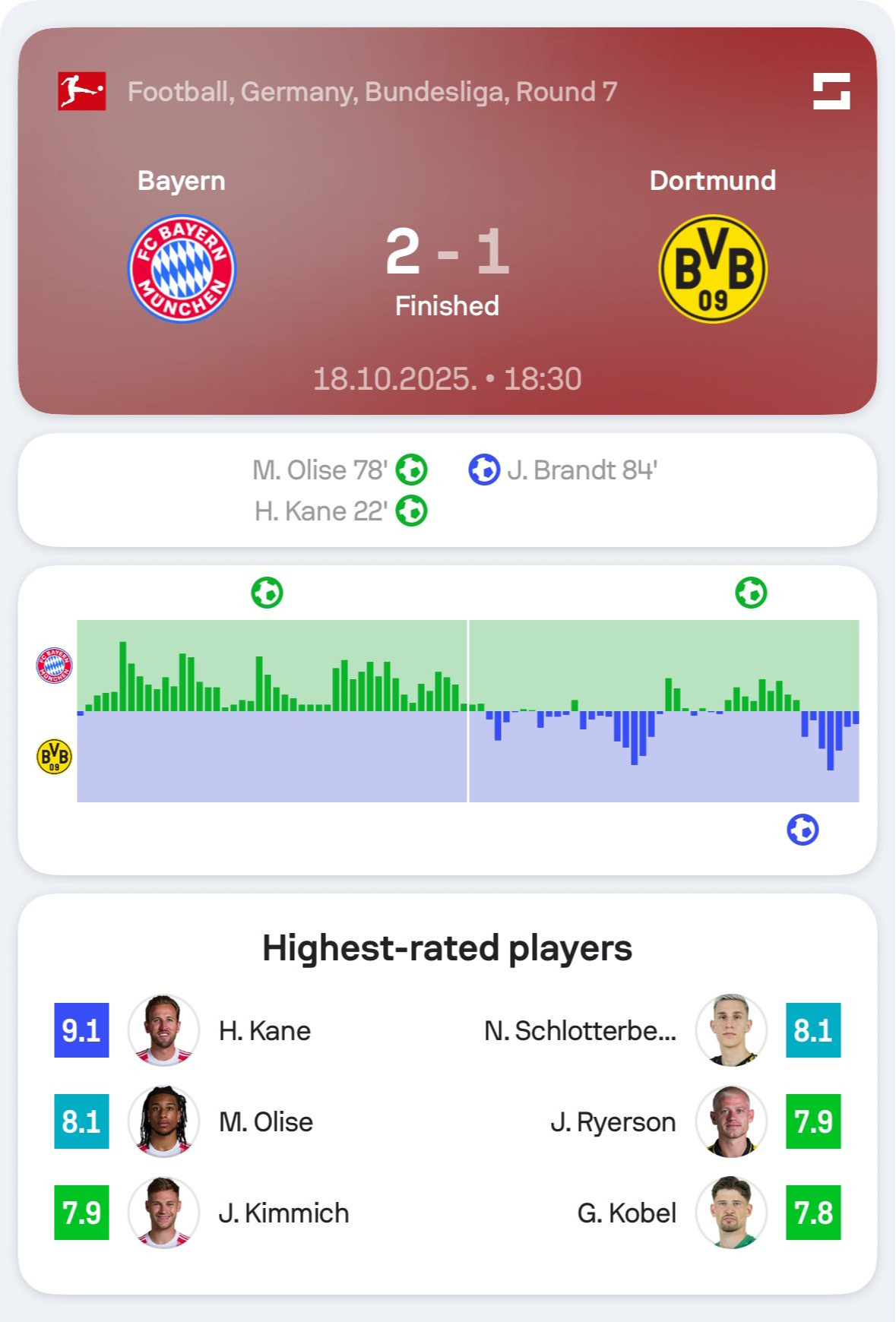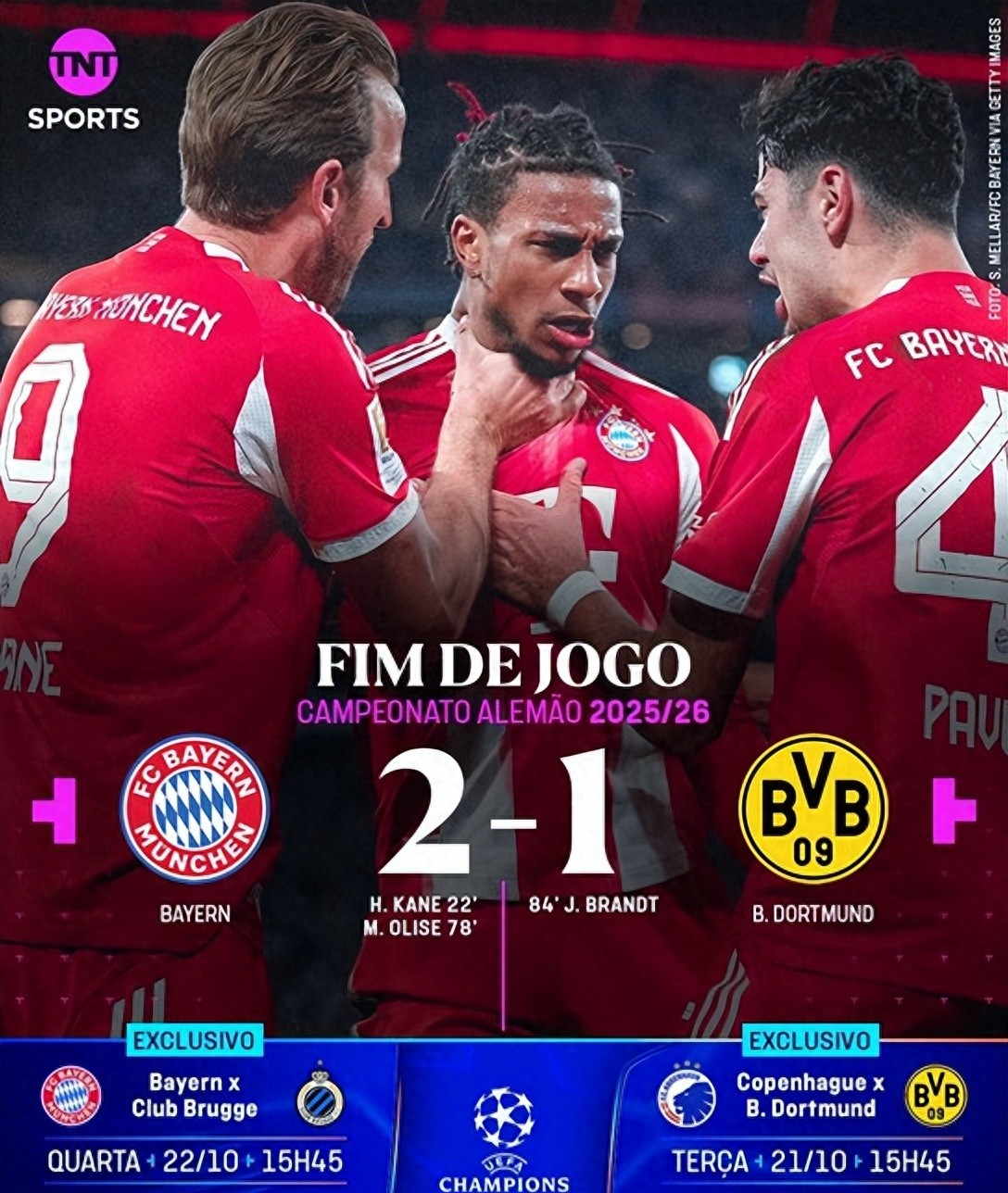 在25/26赛季德甲联赛第7轮的一场焦点大战、德国国家德比拜仁慕尼黑vs多特蒙德的较量中,坐镇主场的拜仁凭借上半场凯恩和下半场奥丽塞的进球,即便有布兰特在下半场第84分钟的一粒进球让最后时刻的比赛悬念再起,但南大王最终还是守住了优势,主场2-1击败了多特。