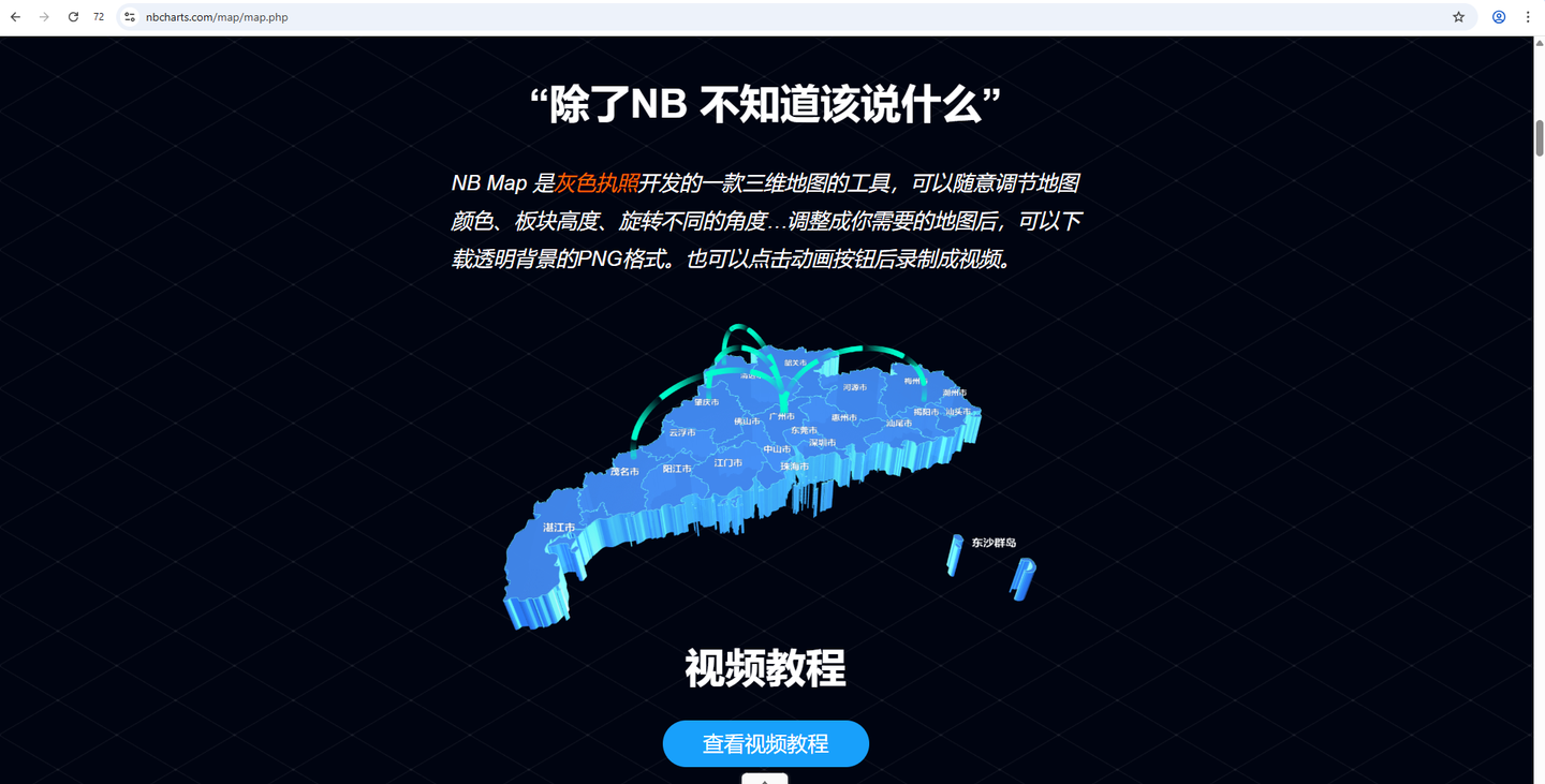 2、NBMap这是一个可以免费生成三维视角地图的网站,只需要选择想要生成三维地图的位置,就能生成效果,使用鼠标就可以控制角度和大小缩放,在右侧就可以直接设置地图的属性。例如修改某个区域的厚度,地图的颜色,还有柱状图、扩展点、轨迹飞线等等功能。