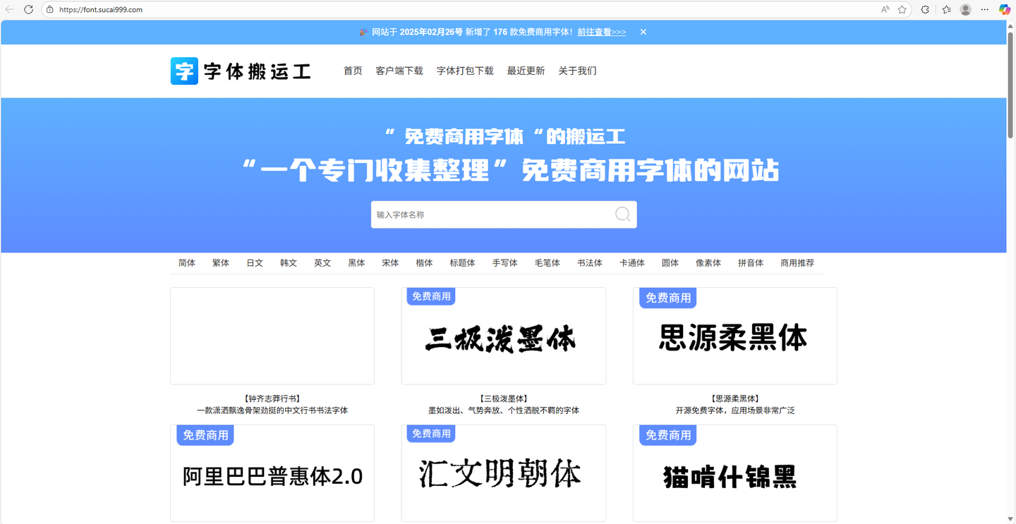 一个免费公益性的字体网站,里面收录的都是可以商用,并且免费的字体。使用的时候可以搜索自己想要查找的字体,也可以按照种类进行筛选。例如简体、繁体、宋体、黑体,甚至韩文、英文字体都可以找到。网站使用非常简单,点击对应字体,可以看到字体的使用效果,还可以看到使用许可,连字体出处都能看到,并且点击即可下载,网站没有广告,不用登录,打开即用,并且还在不断更新新的免费字体。有兴趣的可以登录看一下能不能找到自己想要的字体。