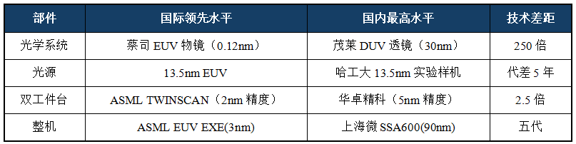 EUV光刻机作为先进制程的核心载体,其极端制造要求构成了国产替代的核心壁垒。一是EUV光刻机需产生13.5nm极紫外光,而13.5nm波长的极紫外光会被几乎所有物质吸收,必须采用全反射光学系统;二是需要维持超高真空环境,任何微小颗粒都会破坏工艺;三是整套系统包含超过10万个精密零部件,供应链管理极其复杂。ASML的EUV光刻机研发耗时17年,累计投入超70亿欧元,依赖全球5000余家供应商协同。上述极致技术要求,导致国产光刻机与国际领先水平存在显著代差,构成了国产替代的核心挑战。从技术代际看,上海微电子最先进的90nm光刻机,技术水平相当于ASML 2004年量产机型,两者相差约五代;从关键指标对比,国产光学元件精度落后国际领先水平250倍,华卓精科双工件台精度(5nm)与ASML TWINSCAN系列(2nm)存在2.5倍差距。