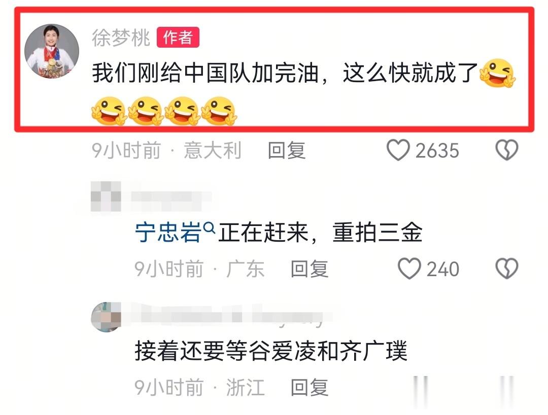 徐梦桃都忍不住在评论区感慨,“我们刚给中国队加完油,这么快就成了”,网友也热情回复,再等等,还有谷爱凌和齐广璞在赶来的路上了