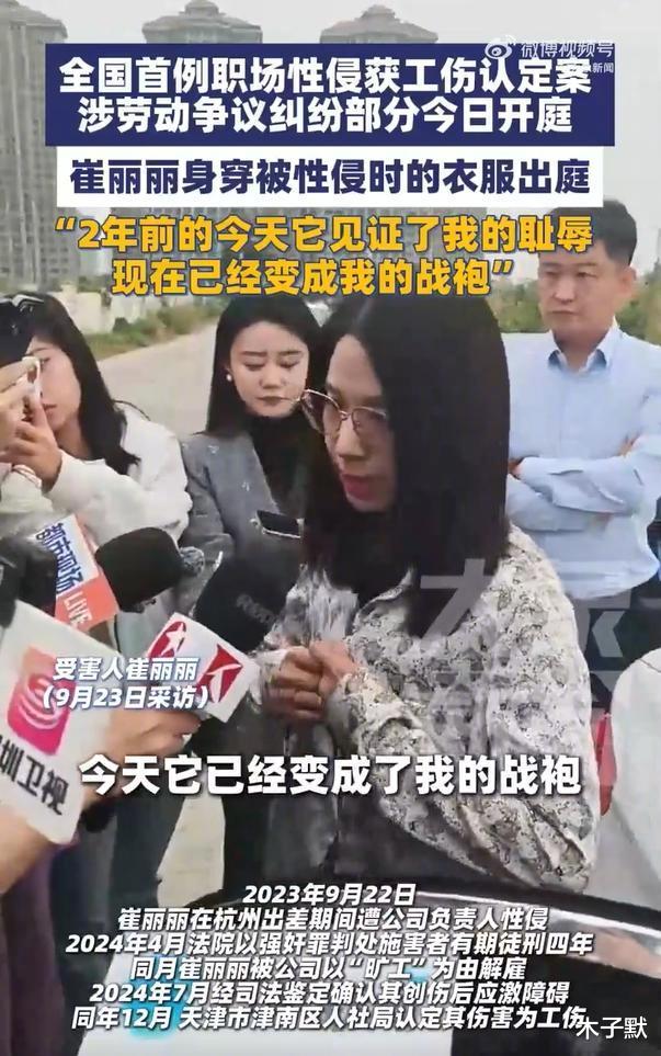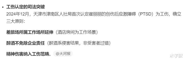 2024年12月,天津津南区人社局首次认定崔丽丽因性侵患上创伤后应激障碍(PTSD)精神损伤为工伤,被称为工伤认定里程碑。