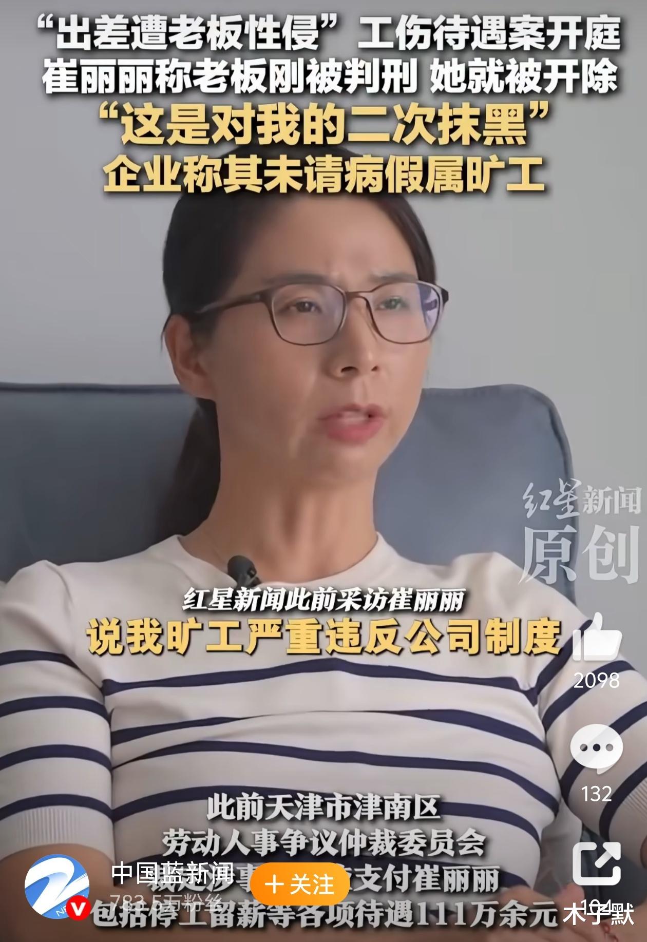 崔丽丽称老板刚被判刑,她就被开除“这是对我的二次抹黑”,企业称其未请病假属旷工。2024年4月18日也就是王某判刑后仅16天,公司以“未请假旷工112天”为由开除崔丽丽。