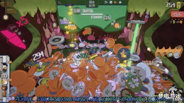 这时,你甚至还能放入被视作水源的水滴币来进一步导电……简单来说就是在这样一个推币游戏里,你能打出弹幕射击肉鸽游戏中常见的攻击套攻击再套攻击的“套娃”构筑,而看着代币以夸张的理由在屏幕中无限堆叠甚至满天乱飞,也是本作最大的爽感来源。
