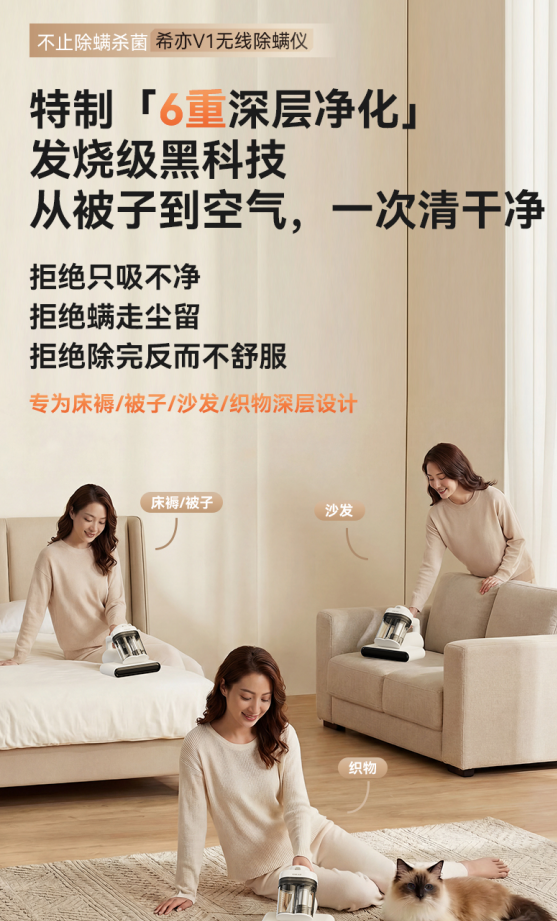 通过热风控湿与空气净化的系统协同,希亦V1无线除螨仪不仅完成表层清洁,更从织物微环境管理层面强化抑湿与净化能力,使除螨与祛湿形成闭环式解决方案。