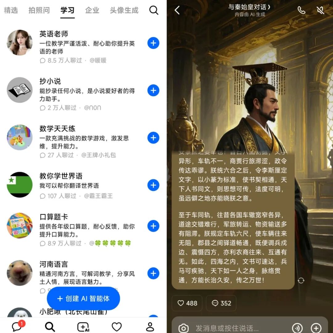 比如,智能体小学语文老师,有着耐心细心、关爱学生的人设,任何小学语文问题都愿意解答;AI:与秦始皇对话,则以秦始皇的口吻与用户对话,与其讨论相关政策与观点。