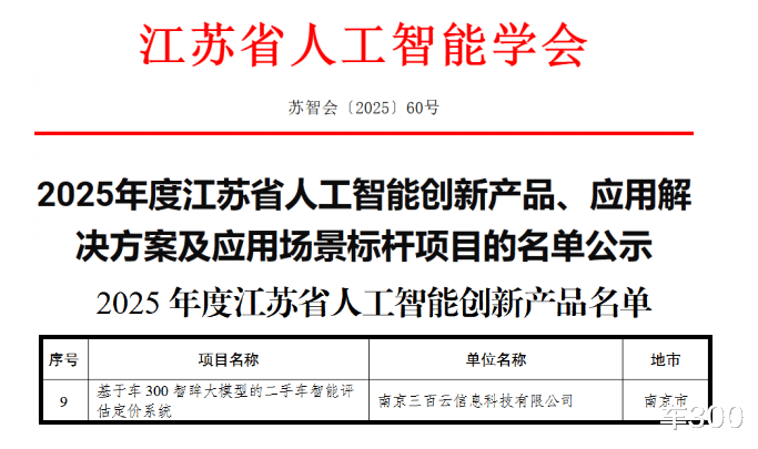在12月27日召开的2025江苏省人工智能产业发展大会上,车300的二手车智能评估定价系统因在AI与汽车金融领域的创新融合而入选省级创新产品。