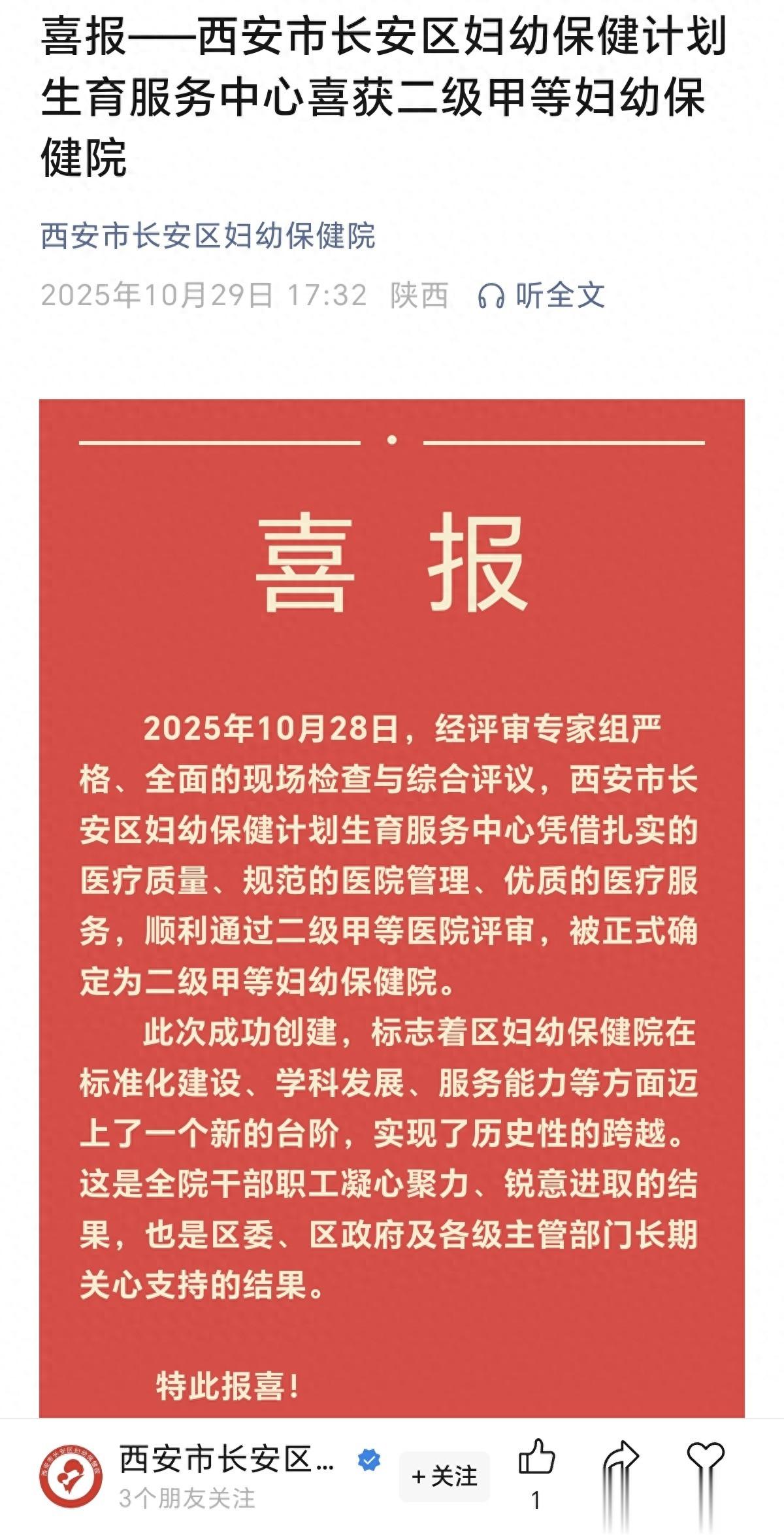 2025年10月28日,经评审专家组严格、全面的现场检查与综合评议,西安市长安区妇幼保健计划生育服务中心凭借扎实的医疗质量、规范的医院管理、优质的医疗服务,顺利通过二级甲等医院评审,被正式确定为二级甲等妇幼保健院。