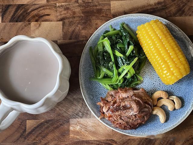 早餐:玉米半根+豆浆250克+卤牛肉30克+菠菜100克+腰果4个;热量约360大卡