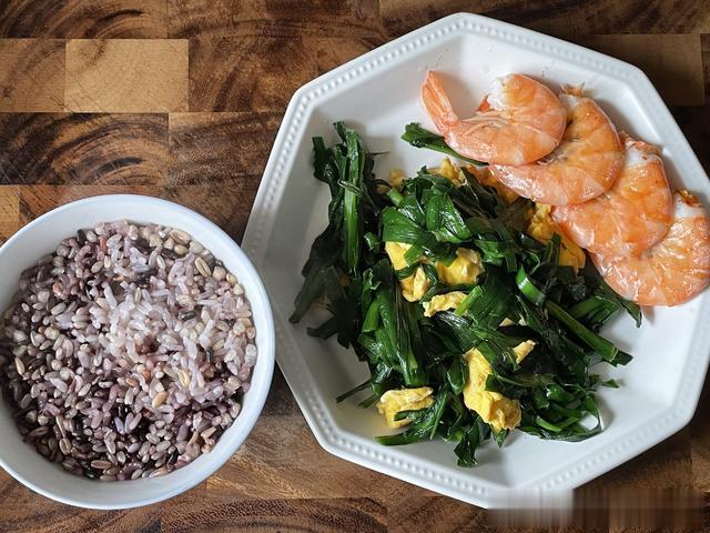 食材搭配营养分解富含膳食纤维的主食:玉米富含膳食纤维,可增加饱腹感,延缓碳水化合物的消化吸收,有助于控制血糖上升速度。优质蛋白质来源:卤牛肉、豆浆、优质蛋白质的良好来源。蛋白质是身体修复和生长的重要营养素,同时在消化过程中需要消耗更多的能量,够增加饱腹感,减少食欲和对其他高热量食物的渴望。低卡蔬菜:菠菜是高纤食材,有助于增加饱腹感,减少总体热量摄入。健康脂肪:腰果含有一定量的健康脂肪,如不饱和脂肪酸,适量摄入有助于维持身体正常的生理功能,但由于其热量较高,需控制摄入量,10 克左右为宜。午餐:杂粮饭1碗+白灼虾80克+韭菜炒鸡蛋150克;热量约380大卡