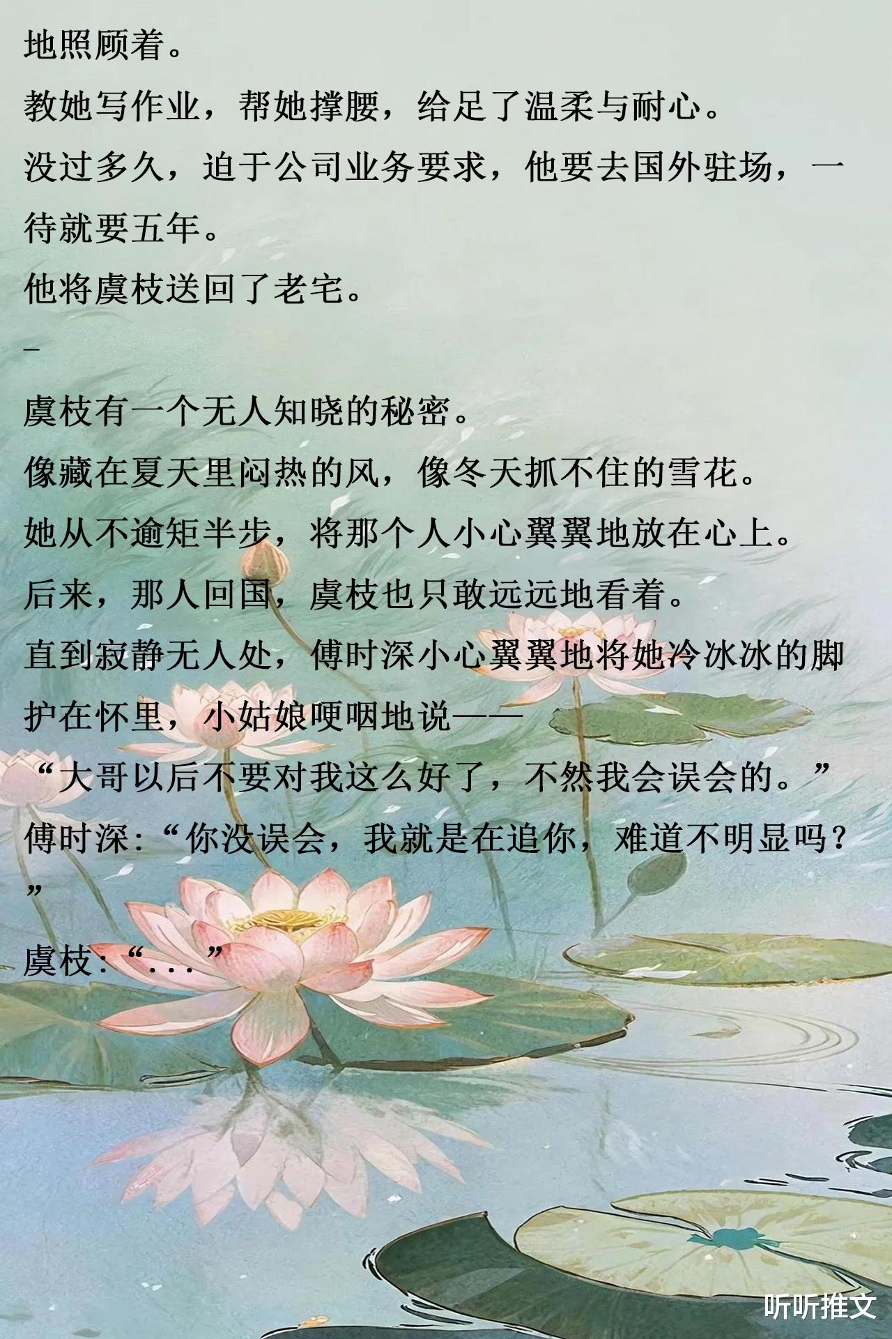 书评:十七岁那年,虞枝外婆去世,她被托付给傅老太太,傅老太太年纪大了,就想找一个合适的儿孙帮忙照顾虞枝,而虞枝一眼看中了傅家长孙傅时深。之后虞枝就被交托给了傅时深,两人朝夕相处,傅时深虽然嫌麻烦,但还是尽心照料,然而她不知道的是,虞枝早已对他动了心。没过多久,傅时深出过开展业务,虞枝被送回,这场暗恋也被虞枝深埋心底。五年后,傅时深回国,虞枝也不敢靠近,反而是傅时深发起了直球攻势。