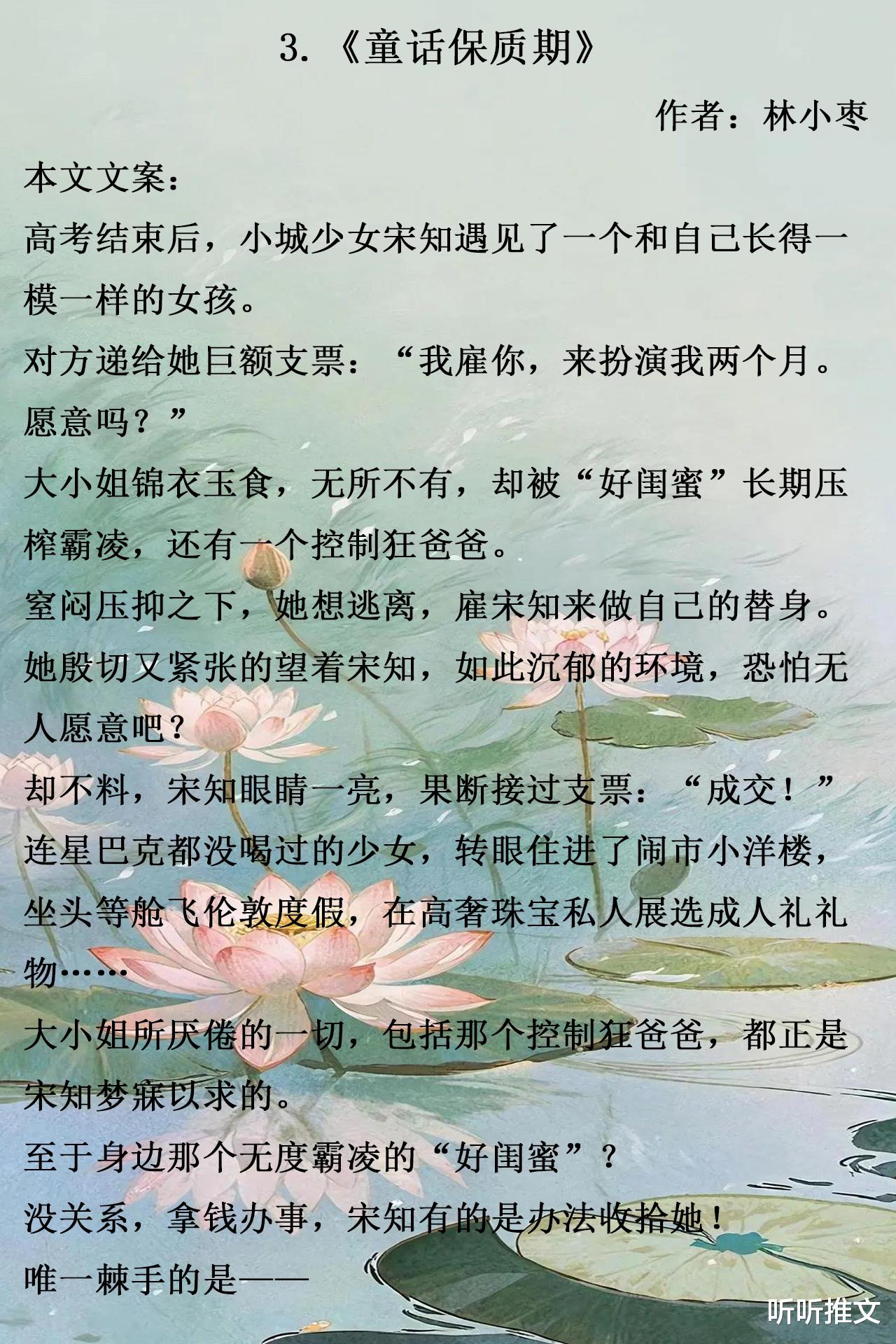 书评:高考结束后,小城少女宋知遇见一个和自己长得一模一样的大小姐,并和对方做了交易,宋知要扮演对方两个月。宋知拿钱办事,体验了大小姐的豪气生活,为大小姐解决了“好闺蜜”的压榨霸凌。而在这一过程中,她与大小姐的发小陈焰相知相伴,两人从搭伴玩耍到迷恋不已,而陈焰也逐渐发现了宋知的身份……