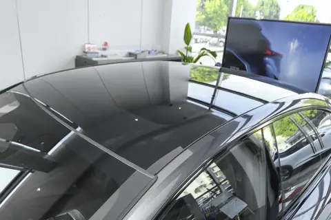 车身侧面的比例也很协调,车窗的线条从前往后逐渐收窄,搭配大尺寸的轮毂,看起来特别运动。轮毂的设计也很有个性,多辐式造型搭配黑色涂装,显得很有力量感。车门采用的是隐藏式门把手,不仅提升了整车的科技感,还能降低风阻,对续航也有一定的帮助。